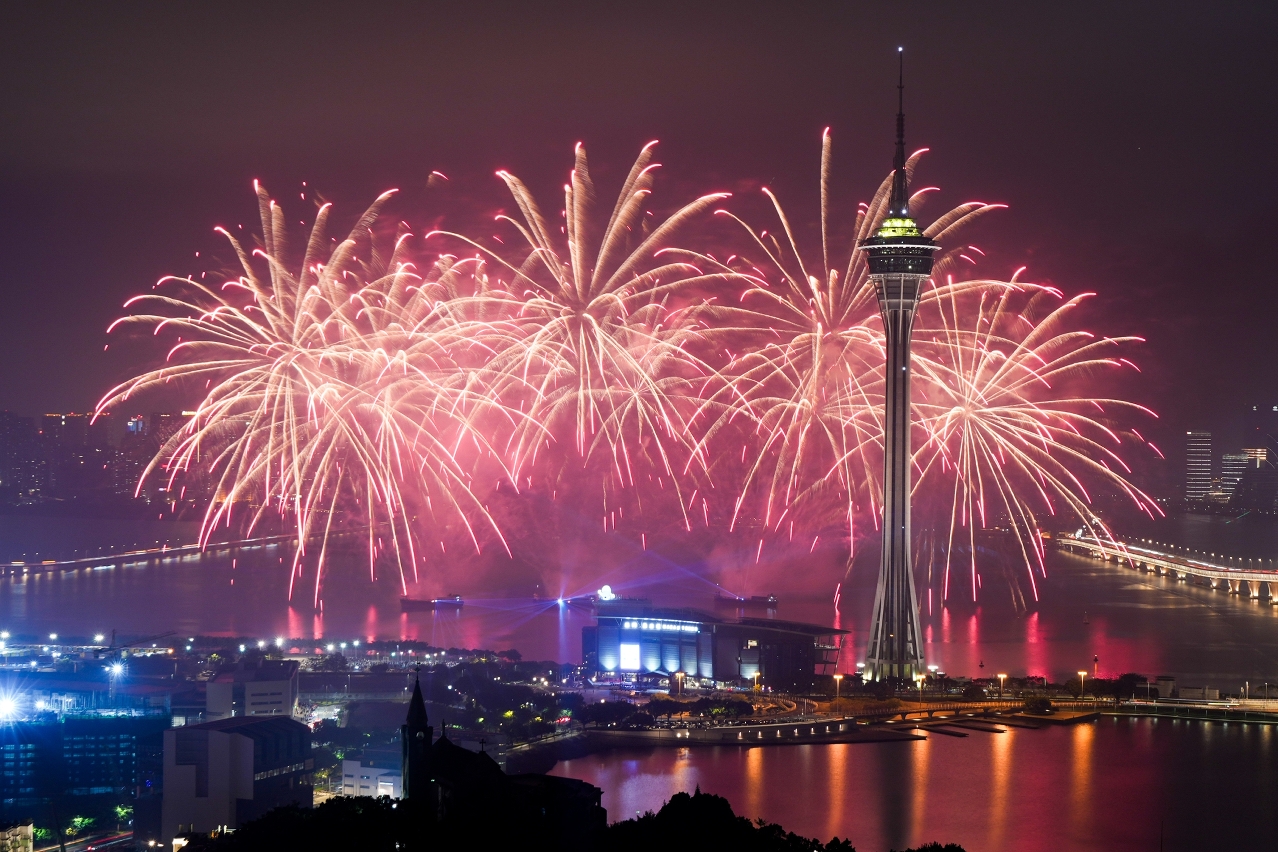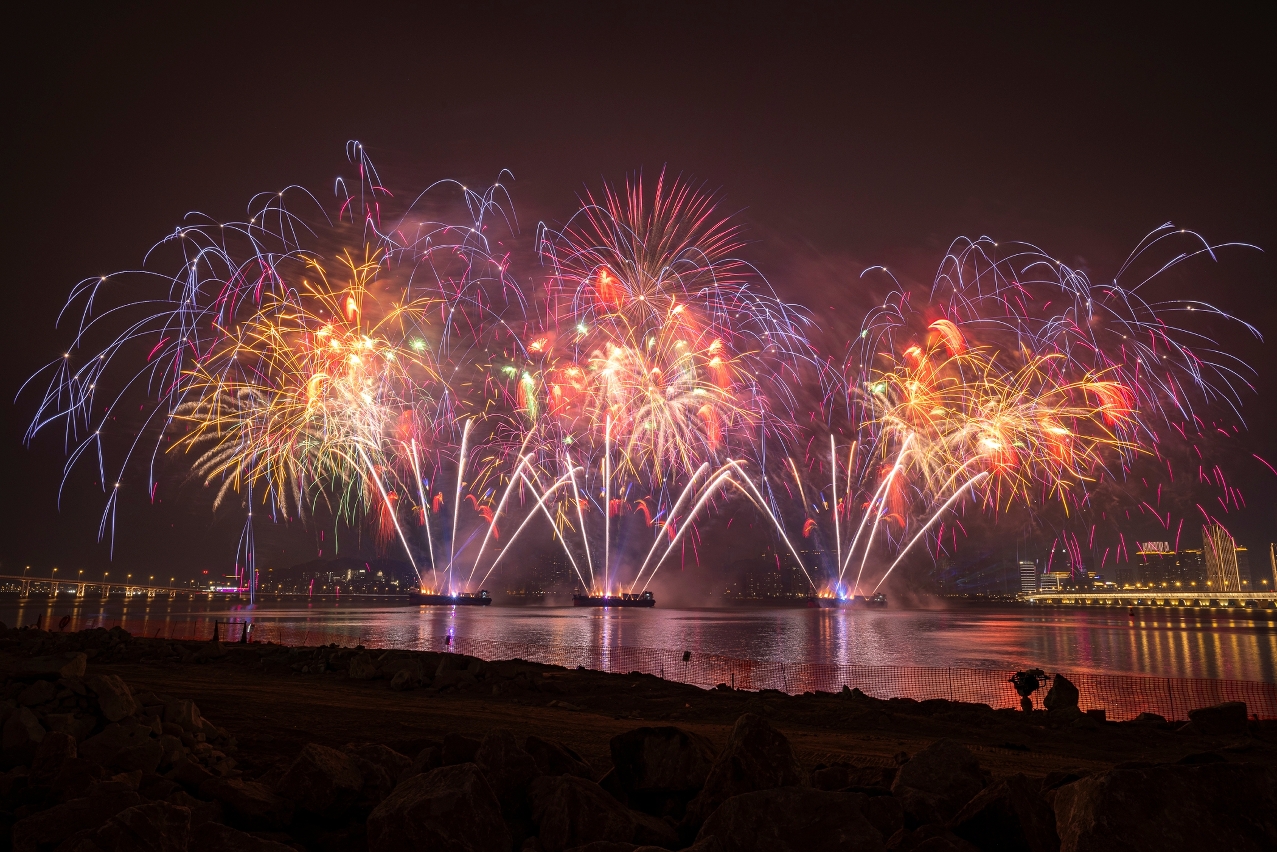 Tendo como fio condutor o amor pela Pátria e por Macau, ao som de música romântica e aconchegante, e efeitos laser, às 21h00 o fogo-de-artifício subiu em esplendor ao céu na zona ribeirinha em frente à Torre de Macau. A exibição girou em torno de cinco temas, incluindo “Olá Macau!”, “Coração Puro Acompanha Rejuvenescimento”, “Nova Viagem em Macau”, “Cenas de Macau no Natal” e “Noite com fogo-de-artifício no Natal em Macau”.
