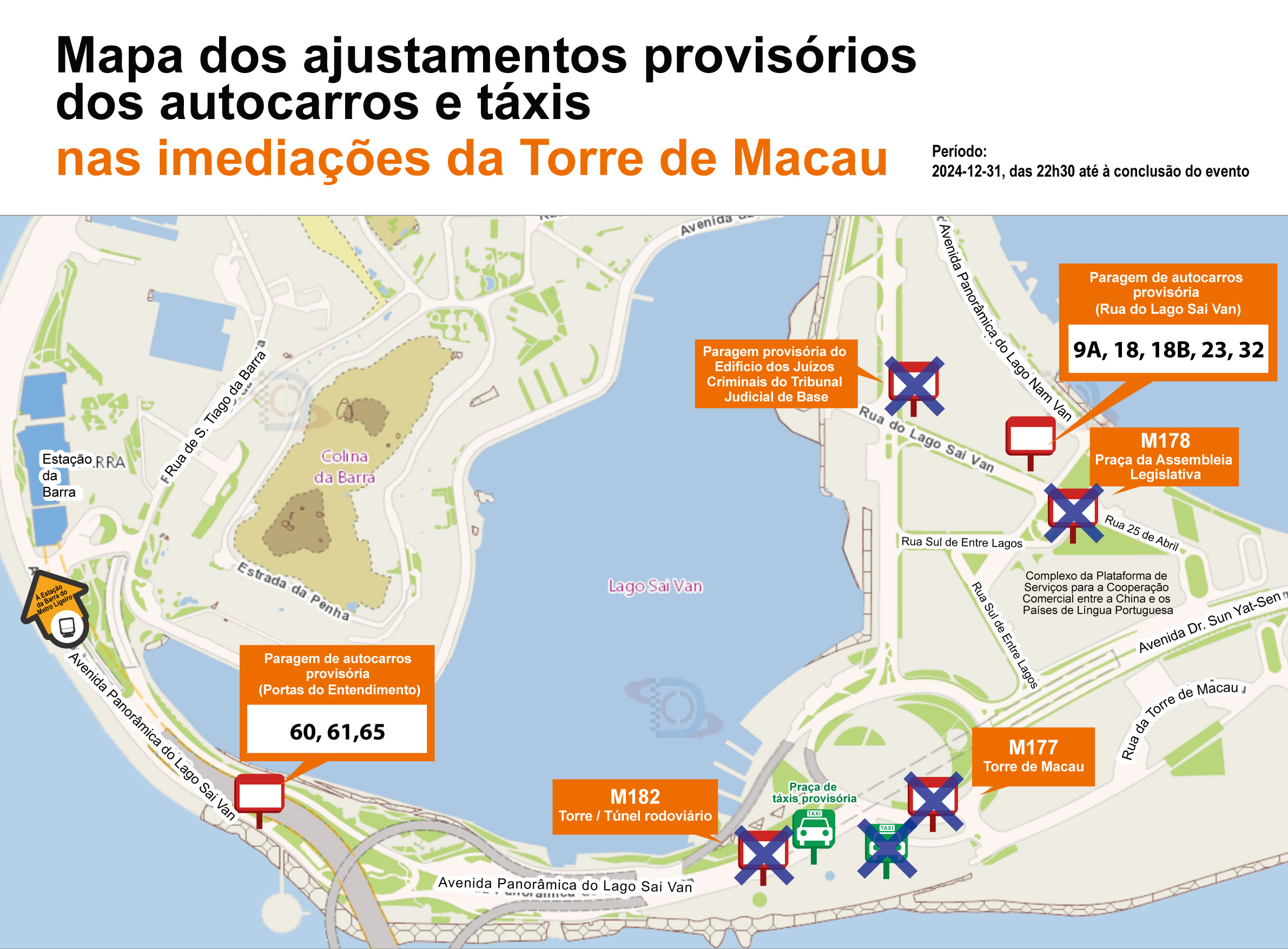 Tendo em conta a realização de actividades de contagem decrescente em vários sítios de Macau, na noite da passagem de ano, serão implementados condicionamentos provisórios de trânsito nas imediações da Torre de Macau, na Taipa e na Estrada do Istmo (vide as tabelas em anexo), vários itinerários de autocarros serão alterados e as suas paragens ajustadas. Relativamente à proximidade da Torre de Macau, a paragem provisória do Edifício dos Juízos Criminais do Tribunal Judicial de Base, as paragens “Praça da Assembleia Legislativa”, “Torre de Macau” e “Torre / Túnel Rodoviário” serão temporariamente desactivadas a partir das 22h30 do dia 31 de Dezembro (terça-feira), as carreiras n.os 9A, 18, 18B, 23, 32 poderão utilizar a paragem provisória da Rua do Lago Sai Van para a tomada e largada de passageiros; as carreiras n.os 60, 61 e 65 (em direcção à Praça de Ponte e Horta) passarão a efectuar a tomada e largada de passageiros na paragem provisória junto às Portas do Entendimento; a carreira n.º 65 (em direcção à Rua dos Currais) poderá optar pela paragem “Av. Panorâmica do Lago Sai Van / Centro Modal de Transportes da Barra”. Durante o período acima referido, a carreira n.o 26 também não fará escala nas paragens periféricas da Torre de Macau, os passageiros poderão utilizar a paragem “Av. Panorâmica do Lago Sai Van / Ponte-Cais da Barra” ou “Av. Panorâmica do Lago Sai Van / Centro Modal de Transportes da Barra” como alternativa. O itinerário da carreira n.o 6B será alterado, mantendo-se inalteradas as paragens de escala. Além disso, em relação às necessidades de deslocação ao Posto Fronteiriço Qingmao na zona da Torre de Macau após o evento de passagem de ano, sugere-se que os passageiros utilizem as carreiras n.os 9A e 23 na Rua do Lago Sai Van.