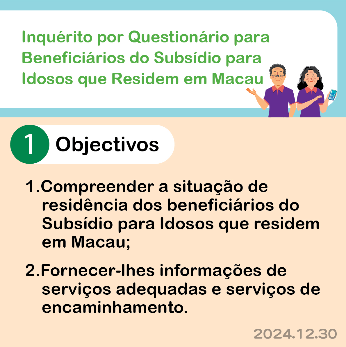 O Instituto de Acção Social irá realizar, de 1 de Janeiro a 31 de Dezembro de 2025, uma actividade intitulada “Inquérito por Questionário para Beneficiários do Subsídio para Idosos que Residem em Macau”, para compreender a situação de residência dos beneficiários do Subsídio para Idosos que residem em Macau, fornecendo-lhes informações e serviços de encaminhamento necessários.