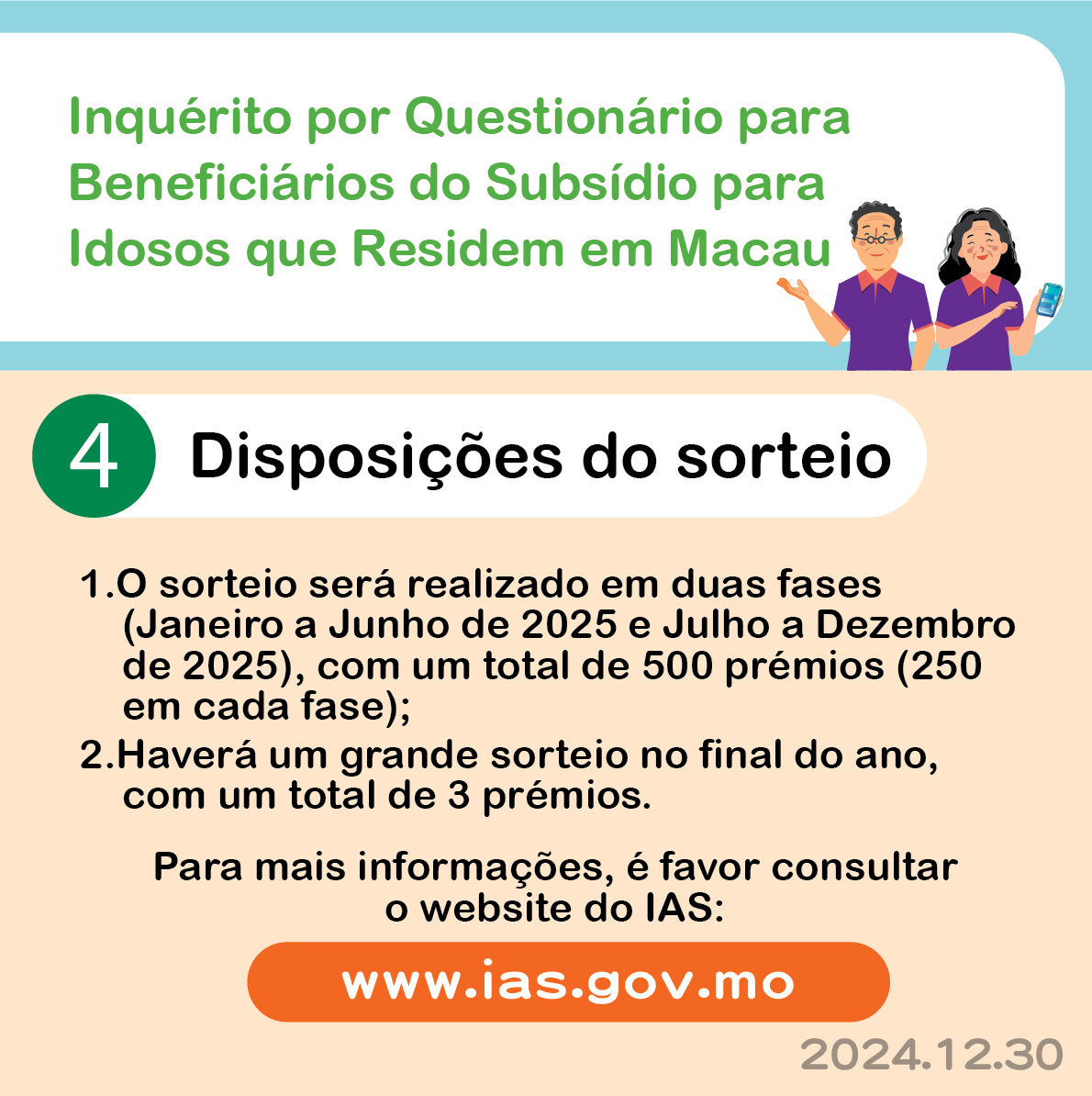O IAS encoraja os beneficiários do Subsídio para Idosos, que residem em Macau e com idade igual ou superior a 65 anos, a preencherem, por si próprios ou com a ajuda de familiares e amigos, um questionário simples através do link para solicitar a prova de vida na "Conta Única de Macau", ou do website temático do IAS https://www.ageing.ias.gov.mo/questionnaire (é necessário fazer login). O conteúdo do questionário inclui a situação de residência e a vontade de recepção de informações de serviço fornecidas pelo Instituto de Acção Social ou pelos equipamentos sociais subsidiados. A fim de incentivar a participação, os beneficiários terão automaticamente a oportunidade de participar no sorteio, após a conclusão do questionário.