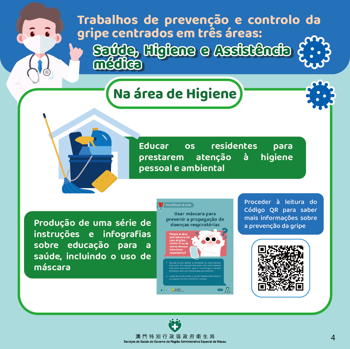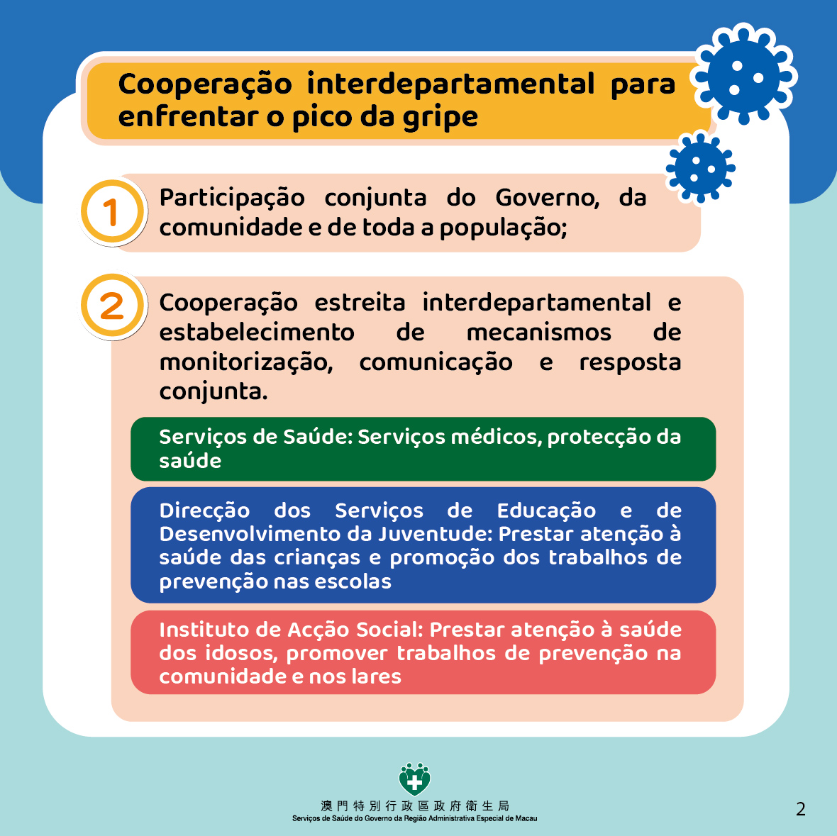 Os Serviços de Saúde, a DSEDJ e o IAS irão iniciar uma série de trabalhos interdepartamentais de prevenção e controlo, nomeadamente no que diz respeito à saúde, higiene e assistência médica. No que diz respeito à saúde, os Serviços de Saúde, em colaboração com as associações sociais e instituições médicas, irão instalar, no próximo fim-de-semana (18 e 19 de Janeiro), 15 postos comunitários de atendimento e informação para a prevenção da gripe junto de todas as zonas de Macau, com vista a reforçar a educação para a saúde e a promover a vacinação. No âmbito da higiene, foram produzidos vários materiais didácticos e infografias, de forma a promover a importância da manutenção da higiene pessoal e ambiental através da internet (página electrónica sobre informações de doenças transmissíveis: https://www.ssm.gov.mo/portal/csr/ch/main.aspx).