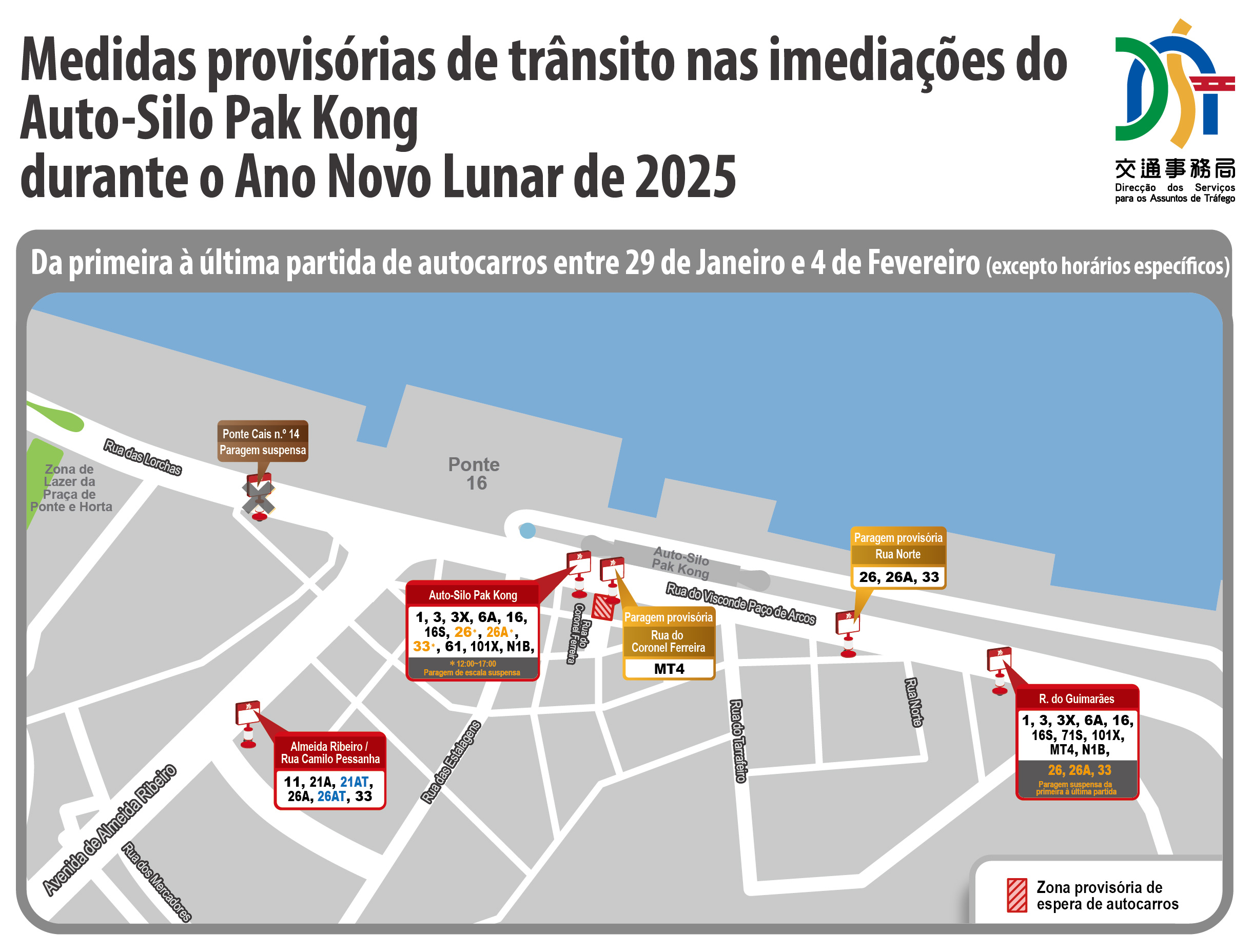 Em resposta às necessidades de deslocação dos residentes e turistas durante o Ano Novo Lunar, a Direcção dos Serviços para os Assuntos de Tráfego (DSAT), tendo coordenado com o Corpo de Polícia de Segurança Pública (CPSP), os Serviços de Alfândega (SA), o Instituto para os Assuntos Municipais (IAM), as companhias de autocarros, o transporte transfronteiriço de passageiros, as operadoras de jogo, os hotéis e a empresa de gestão do lado este da Praça das Portas do Cerco, irá implementar medidas provisórias em locais onde se prevê um grande fluxo de pessoas e veículos, por forma a evitar os potenciais riscos daí resultantes.
