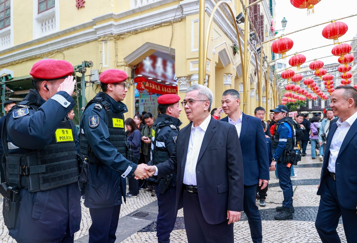 Durante o período do Ano Novo Lunar, realizou-se em Macau uma série de actividades de celebração em diferentes zonas da cidade. Para assegurar uma passagem de Ano Novo tranquila e em segurança, os agentes das forças e serviços de segurança mantiveram-se nos seus postos durante os feriados, garantindo deste modo a estabilidade, a segurança e a ordem pública, ao mesmo tempo que prestavam um serviço de excelência aos cidadãos e turistas. O Secretário para a Segurança, Wong Sio Chak, acompanhado pelo Comandante-geral dos Serviços de Polícia Unitários, Leong Man Cheong, pelo Director-geral dos Serviços de Alfândega, Adriano Marques Ho, e pelo pessoal de direcção e chefia das forças e serviços de segurança, fez no presente dia (3.º dia do Ano Novo Chinês), vistoria às unidades de trabalho da linha da frente e apresentou cumprimentos aos colegas que se encontravam de serviço.