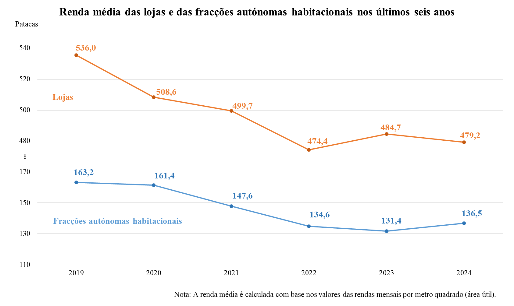 Análise por trimestre, a renda média por metro quadrado das fracções autónomas destinadas a lojas foi de 489 Patacas no quarto trimestre de 2024, menos 0,3%, em relação ao trimestre anterior. A renda média das fracções autónomas destinadas a escritórios (293 Patacas) e a das fracções autónomas industriais (123 Patacas) desceram 0,8% e 0,2%, respectivamente, em termos trimestrais, enquanto a das fracções autónomas habitacionais (138 Patacas) ascendeu 0,7%.