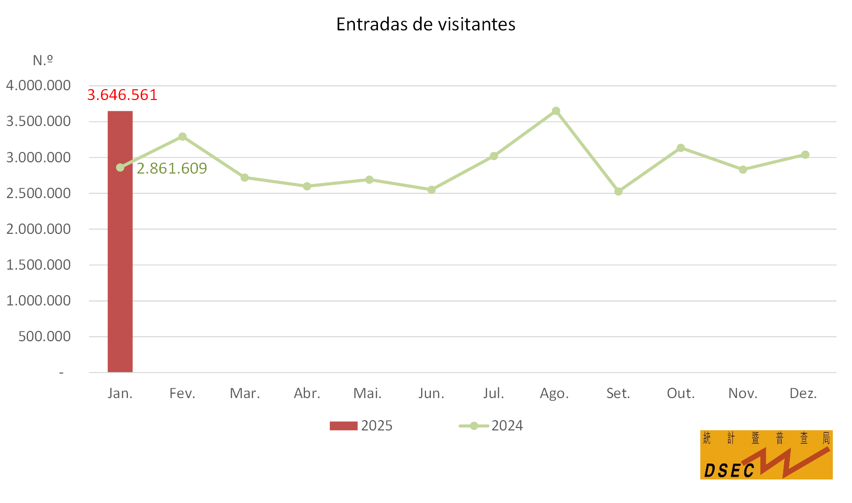 Em Janeiro de 2025 o número de entradas de visitantes em Macau foi de 3.646.561, mais 27,4%, em termos anuais. Realça-se que o número de entradas de excursionistas (2.155.279) e o de turistas (1.491.282) aumentaram 45,6% e 7,9%, respectivamente, em termos anuais. O período médio de permanência dos visitantes situou-se em 1,0 dias, menos 0,2 dias, face a Janeiro de 2024, devido principalmente ao aumento homólogo da proporção de excursionistas em relação ao total de visitantes. Salienta-se que o período médio de permanência dos excursionistas (0,3 dias) aumentou 0,1 dias e que o dos turistas (2,2 dias) se manteve, informam os Serviços de Estatística e Censos.