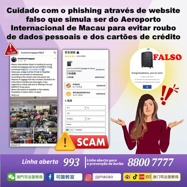 • Cuidado com o phishing através de website falso que simula ser do Aeroporto Internacional de Macau para evitar roubo de dados pessoais e dos cartões de crédito