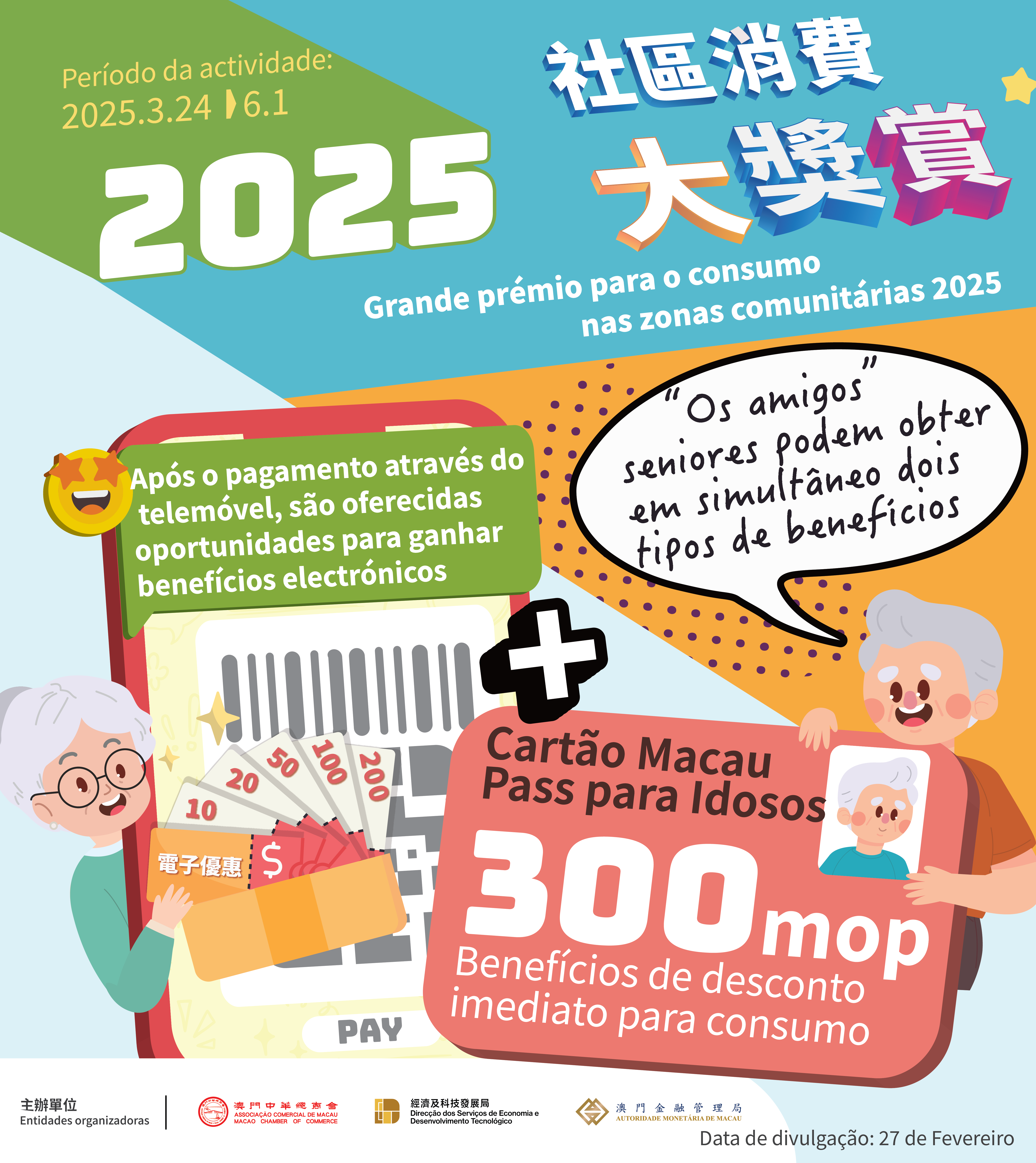O Governo da RAEM, a associação comercial e as diversas entidades colaboradoras estão a envidar todos os esforços para a preparação do lançamento da actividade de promoção de consumo de grande dimensão intitulada “Grande prémio para o consumo nas zonas comunitárias 2025”, em 24 de Março. Esta actividade é composta por duas partes: “Benefício electrónico através do pagamento móvel” e “desconto imediato para consumo de idosos”.