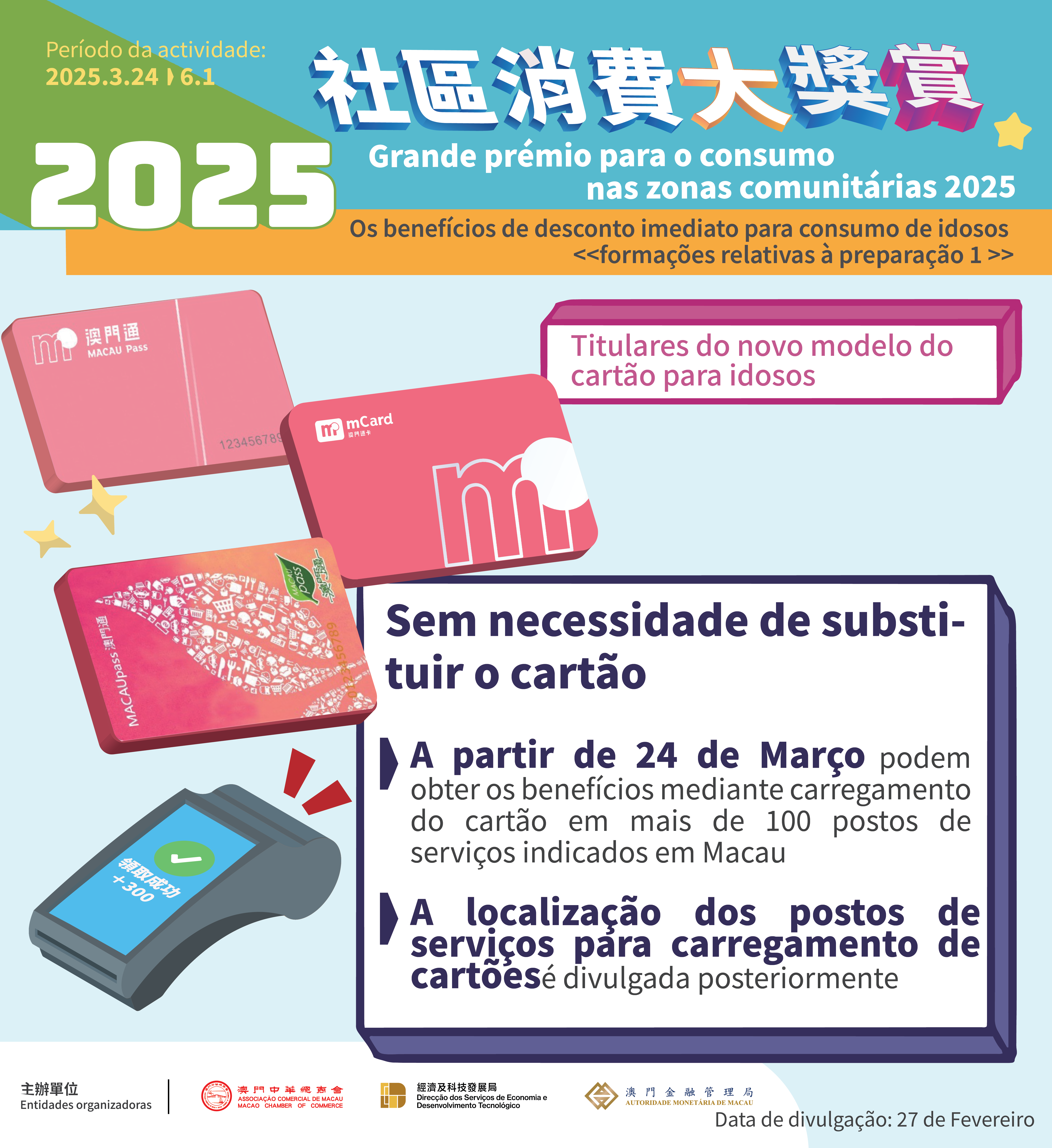 O Governo da RAEM e a associação comercial organizaram a actividade de promoção de consumo de grande dimensão intitulada “Grande prémio para o consumo nas zonas comunitárias 2025”, que decorre entre 24 de Março e 1 de Junho. Para cuidar dos idosos, esta actividade proporciona “desconto imediato para consumo de idosos” para além dos anteriores benefícios electrónicos obtidos através do pagamento por telemóvel após consumo. Os idosos que tenham completado 65 anos de idade podem obter desconto imediato para consumo no valor de 300 patacas mediante carregamento da nova versão do “Cartão da Macau Pass para Idosos”.