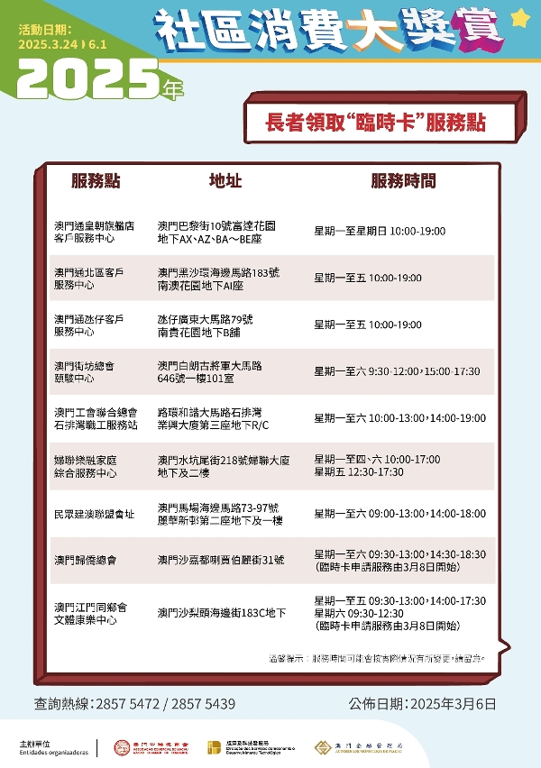 Em articulação com a nova iniciativa de desconto imediato para o consumo dos idosos inserida no “Grande prémio para o consumo nas zonas comunitárias 2025”, e para ajudar os residentes portadores da versão antiga do cartão Macau Pass para idosos a substituir para o novo cartão, a Direcção dos Serviços de Economia e Desenvolvimento Tecnológico (DSEDT) e o Instituto da Acção Social coordenaram as instituições de serviço social e as associações cívicas na instalação de mais de 60 postos de serviços para substituição de cartões, os quais começaram a funcionar a partir de ontem (dia 6). Até às 17:00 horas do dia 7 de Março, mais de 5.200 residentes concluíram as formalidades de substituição do cartão ou de emissão de 2.ª via por motivo de extravio, entre os quais, cerca de 20% pediram e receberam o cartão provisório.