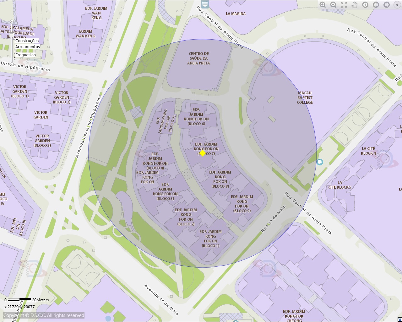 • Áreas da eliminação química de mosquitos perto do Jardim Kong Fok On (Bloco 7), da Areia Preta