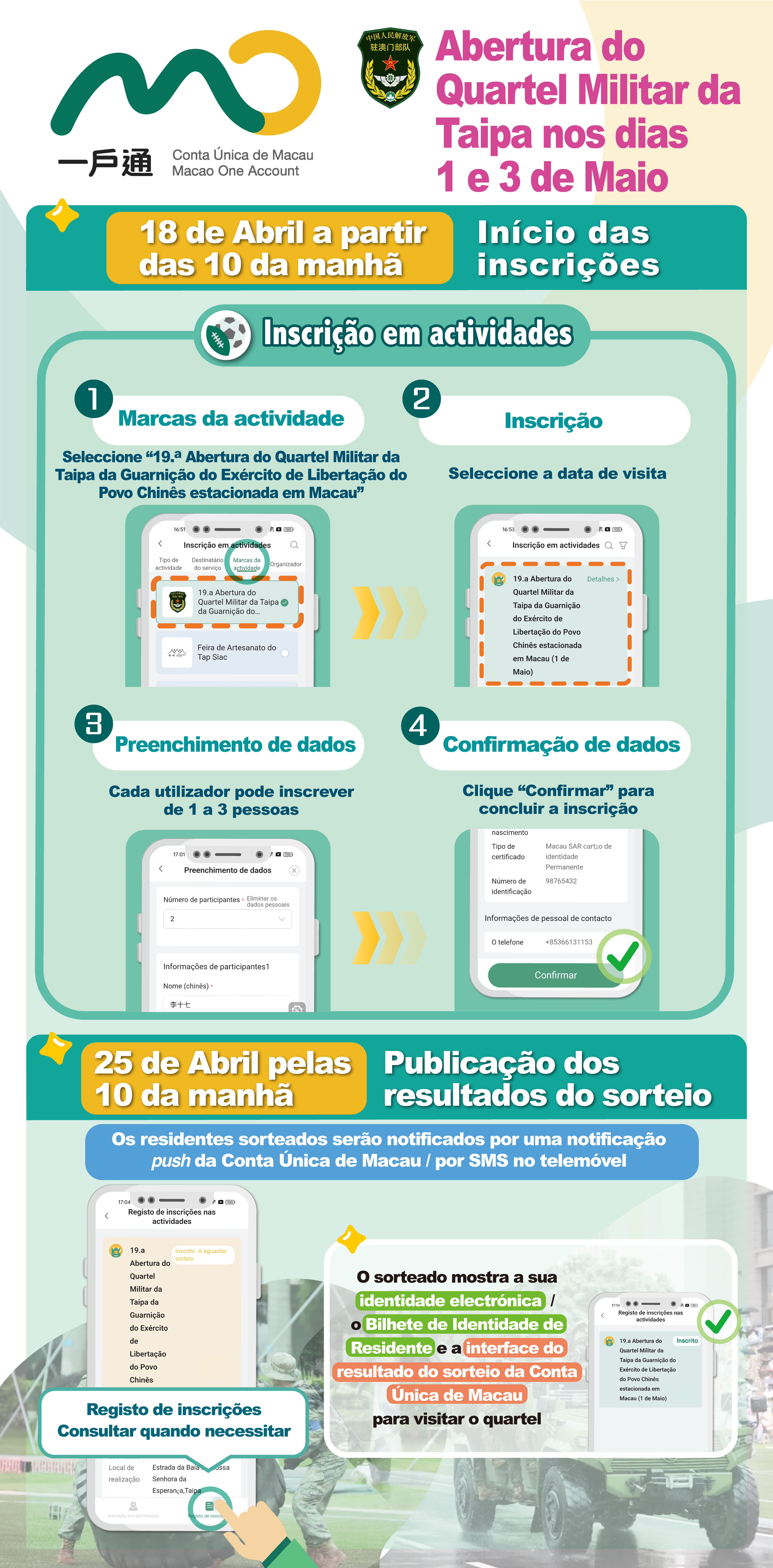 Durante o horário de abertura do quartel militar, o residente sorteado deve exibir, para entrar no quartel, o BIR (identidade electrónica da Conta Única de Macau ou o documento físico) e a interface do resultado do sorteio da Conta Única de Macau, as crianças com idade igual ou inferior a seis anos podem entrar com o adulto exibindo apenas o BIR (identidade electrónica da Conta Única de Macau ou documento físico).