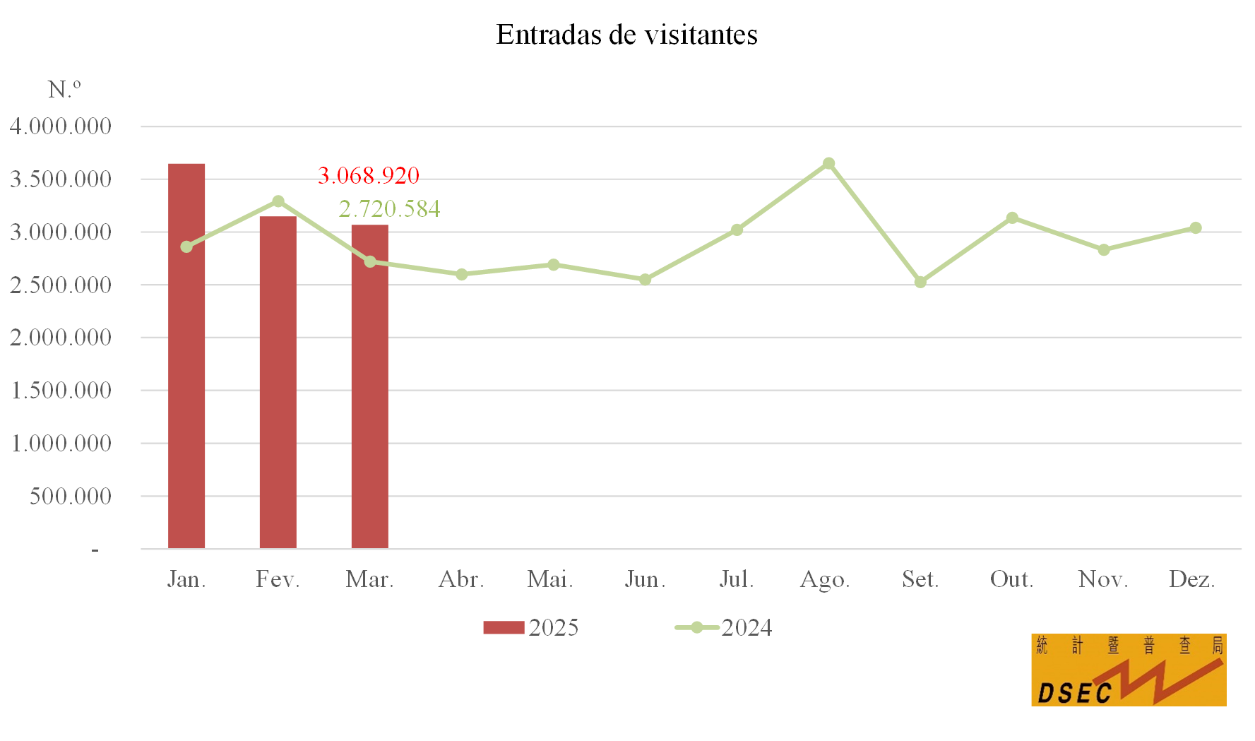 Em Março de 2025 o número de entradas de visitantes em Macau foi de 3.068.920, mais 12,8%, em termos anuais, destacando-se que o de excursionistas (1.780.279) e o de turistas (1.288.641) aumentaram 23,3% e 0,9%, respectivamente. O período médio de permanência dos visitantes correspondeu a 1,1 dias, menos 0,1 dias, face ao mesmo mês do ano anterior, salientando-se que o dos excursionistas (0,2 dias) e o dos turistas (2,3 dias) se mantiveram.