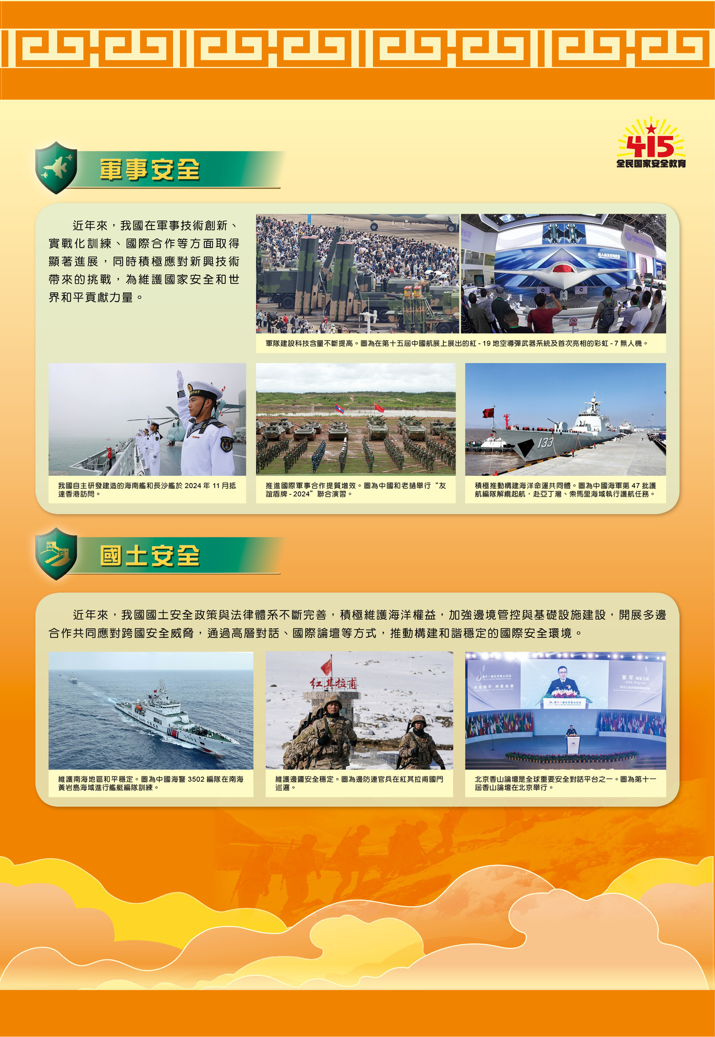 A perspectiva geral da segurança nacional abrange 20 domínios-chave estreitamente interligados, incluindo a segurança política, a segurança militar, a segurança territorial, a segurança económica, a segurança financeira, a segurança científica e tecnológica, a segurança da inteligência artificial, a cibersegurança, a segurança de dados, a segurança da sociedade, a segurança cultural, a segurança alimentar, a segurança ecológica, a segurança biológica, a segurança de recursos, a segurança nuclear, a segurança espacial, a segurança em águas profundas, a segurança polar e a segurança dos interesses no exterior. A segunda parte da exposição mostra os resultados significativos alcançados pela nação na salvaguarda da segurança dos referidos domínios.