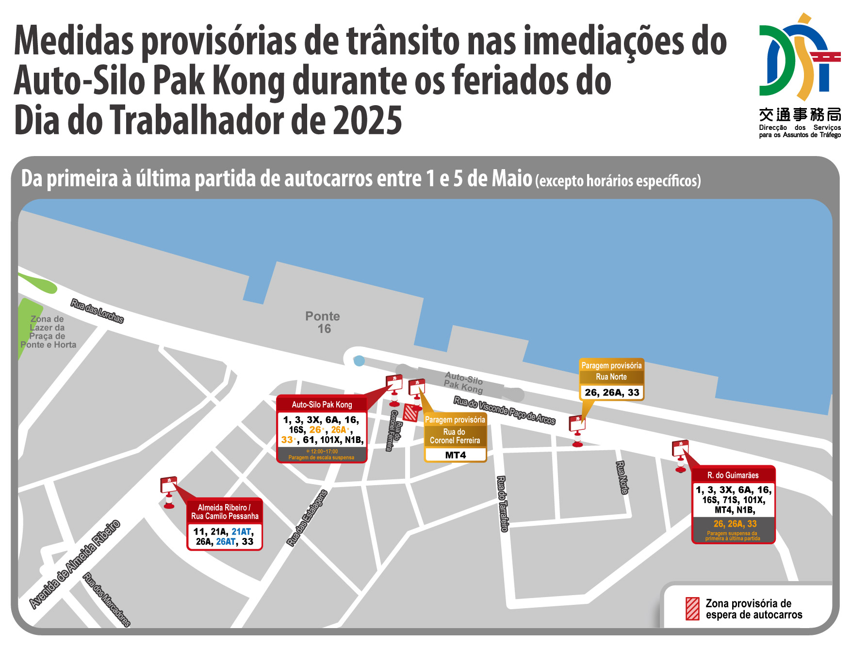 Em resposta às necessidades de deslocação dos residentes e turistas durante os feriados do Dia do Trabalhador, a Direcção dos Serviços para os Assuntos de Tráfego (DSAT), em coordenação com o Corpo de Polícia de Segurança Pública (CPSP), os Serviços de Alfândega (SA), o Instituto para os Assuntos Municipais (IAM), as operadoras de autocarros, o transporte transfronteiriço de passageiros, as operadoras de jogo, os hotéis e a empresa de gestão do lado este da Praça das Portas do Cerco, planeou os condicionamentos de trânsito e os planos de contingência. Entre 30 de Abril (quarta-feira) e 5 de Maio (segunda-feira), serão implementadas várias medidas provisórias de trânsito nos postos fronteiriços de Macau e em locais onde se prevê um grande fluxo de pessoas e veículos. Também será reservada uma área nos postos fronteiriços para a tomada-largada de passageiros de autocarros shuttle dos hotéis e casinos.