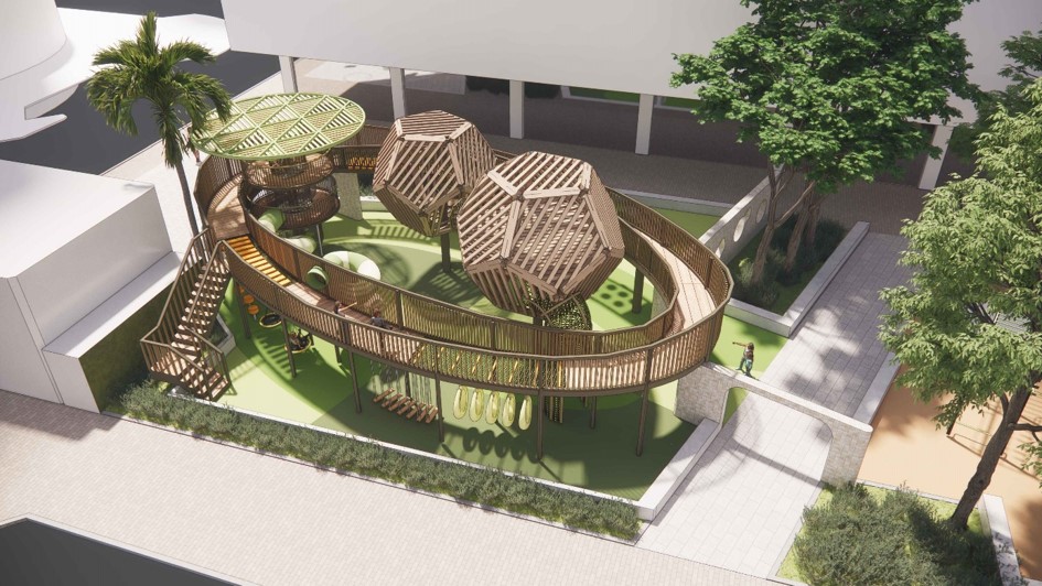 A taxa de utilização da zona de lazer da Rua Central de T'oi Sán é alta, e as suas instalações já estão em funcionamento há muitos anos, pelo que se encontram danificadas. Por esta razão, o IAM adoptou o “oásis urbano” como tema de desenho, integrando elementos naturais e preservando as árvores existentes na zona de lazer. Em harmonia com a paisagem arborizada, é oferecida aos utentes diversão num oásis urbano. Sob a envolvência de árvores, irão ser adicionados equipamentos personalizados para crianças em formato de casa na árvore e instalados trilhos aéreos de aventuras, com vista a aproveitar plenamente o espaço limitado para proporcionar aos jovens e crianças um local para brincar e explorar a natureza. Ao mesmo tempo, será levado a cabo um novo planeamento da disposição, criando zonas desportivas e recreativas, optimizando a linha de circulação pedonal da zona e elevando a qualidade ambiental da zona de lazer.