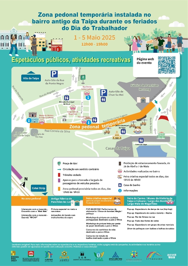 Com vista a garantir a circulação ordenada de pessoas e de veículos no bairro antigo da Taipa durante os feriados do Dia do Trabalhador e criar um ambiente confortável e seguro, a Direcção dos Serviços de Economia e Desenvolvimento Tecnológico (DSEDT), a Direcção dos Serviços para os Assuntos de Tráfego (DSAT), o Corpo de Polícia de Segurança Pública (CPSP), a Direcção dos Serviços de Turismo (DST), o Instituto Cultural e o Instituto para os Assuntos Municipais (IAM), cooperaram com a União Geral das Associações dos Moradores de Macau, a Associação Promotora para o Desenvolvimento da Comunidade da Taipa, a Associação de Moradores da Taipa e a Federação Industrial e Comercial das Ilhas de Macau na criação da “Zona pedonal temporária instalada no bairro antigo da Taipa durante os feriados do Dia do Trabalhador”.
