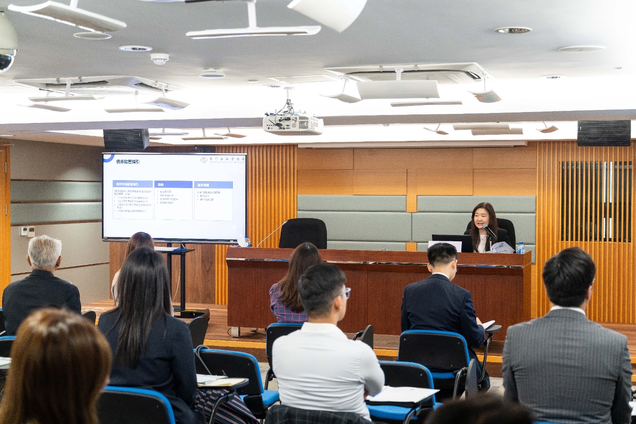 No decurso do seminário, os representantes da AMCM realizaram uma apresentação sobre a evolução recente e as perspectivas futuras do mercado de obrigações de Macau, bem como o regime de supervisão das actividades obrigacionistas locais, tendo sido detalhadas, igualmente, as directivas de supervisão relativas à emissão, registo e liquidação, divulgação de informações, tomada firma de emissão e fidúcia, entre outras actividades. Além disso, foram ainda explicados, através de casos concretos, os processos de emissão de obrigações e os respectivos aspectos práticos essenciais. Paralelamente, os representantes do sector jurídico de Hong Kong partilharam as suas experiências no tratamento de incumprimento de obrigações, procedimentos de liquidação e medidas de resposta adoptadas nos mercados obrigacionistas internacionais e regionais, complementando com uma análise aprofundada de casos concretos sobre os procedimentos legais relevantes. Entretanto, os representantes das instituições que desenvolveram actividades relativas à interligação das infraestruturas dos mercados obrigacionistas em Hong Kong apresentaram a situação actual dos mercados de títulos do Interior da China e de Hong Kong, bem como o modelo de transacção e a tendência de desenvolvimento no contexto do mecanismo da interconexão e interligação entre os mercados obrigacionistas das duas regiões.
