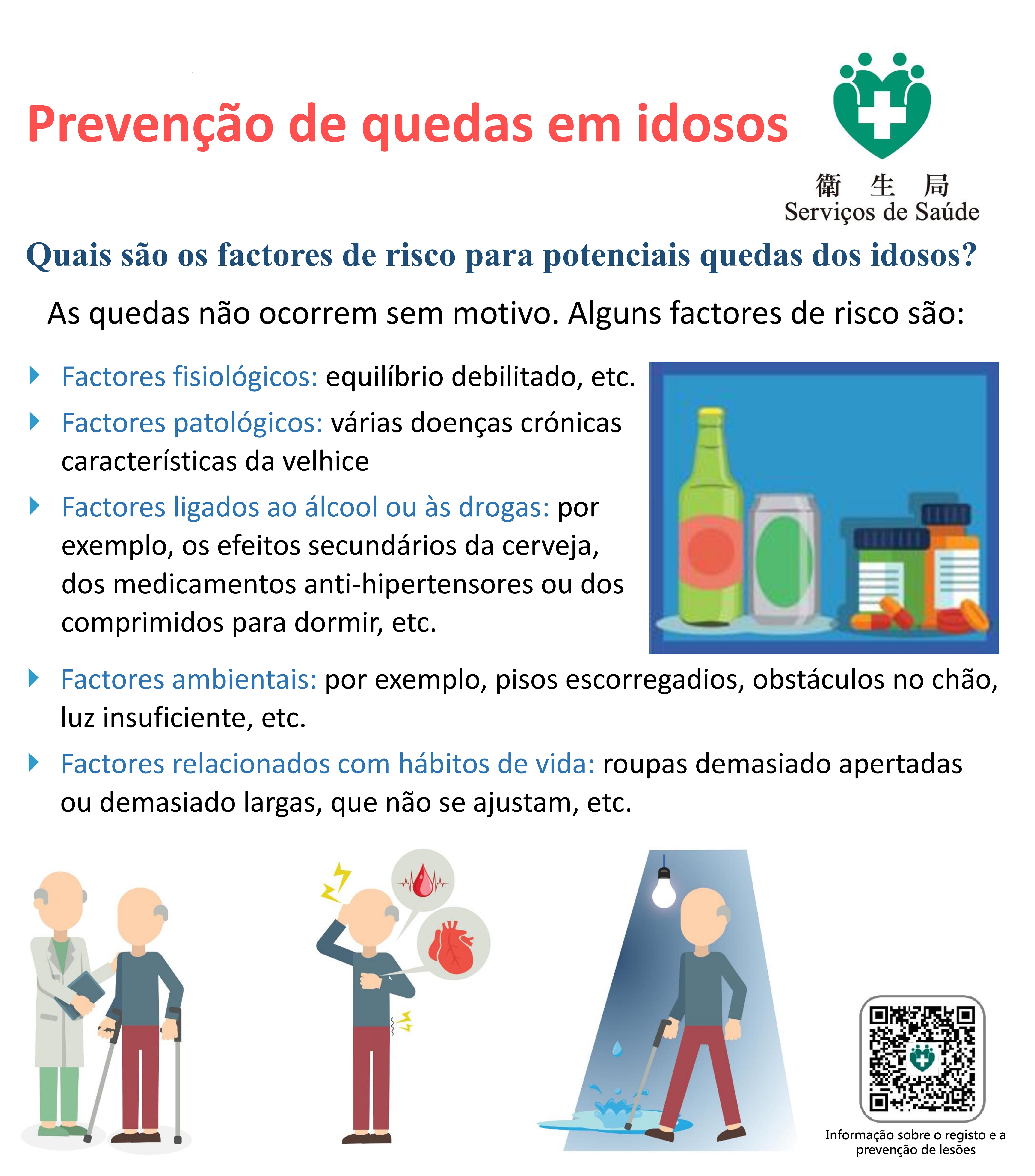 Os Serviços de Saúde alertam que, o risco de queda, de idosos sofridos das doenças crónicas, degeneração visual, entre outros factores, pode ser significativamente aumentado, e causar consequências graves, tais como fracturas ósseas, traumatismos cerebrais, entre outros. A prevenção de quedas não é apenas uma medida importante para assegurar a saúde, mas também a chave para melhorar a qualidade de vida.