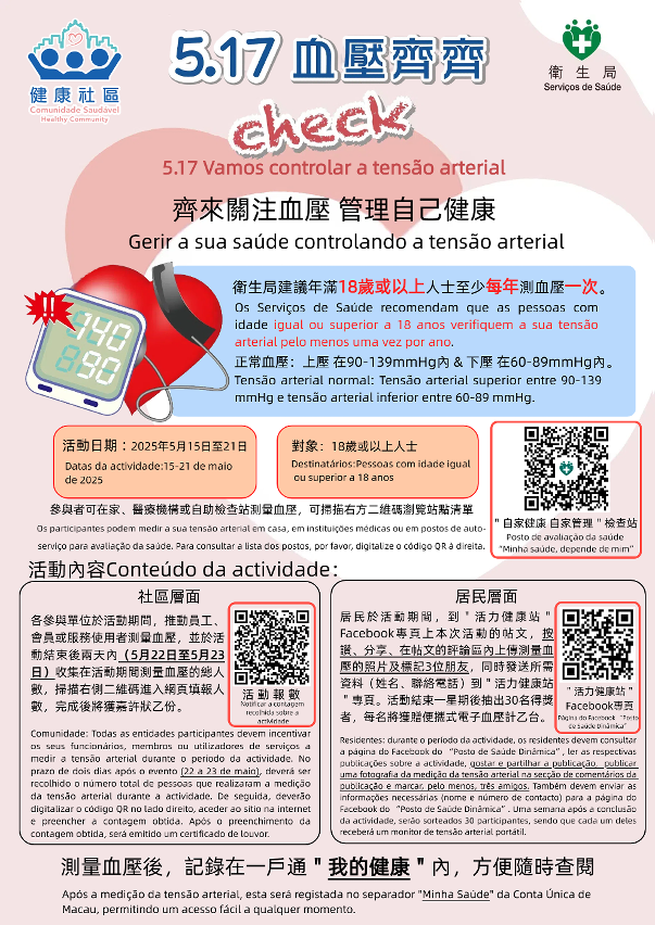 Durante o período do “Dia Mundial da Hipertensão” (de 15 a 21 de Maio), os Serviços de Saúde organizaram actividades de promoção comunitária, que contaram com a participação de instituições e indivíduos (para mais informações, consulte o cartaz “5.17 Vamos controlar a tensão arterial”). Em 2024, esta iniciativa atraiu mais de 12.000 participantes, com uma resposta muito entusiástica. Os Serviços de Saúde sublinharam que continuarão a optimizar as estratégias de prevenção e controlo de doenças crónicas, alargando a cobertura da gestão, promovendo hábitos saudáveis a partir da fonte, em linha com o objectivo estratégico nacional de “protecção da saúde durante todo o ciclo de vida”, e trabalhando em conjunto com os residentes para construir uma comunidade saudável e Macau feliz.