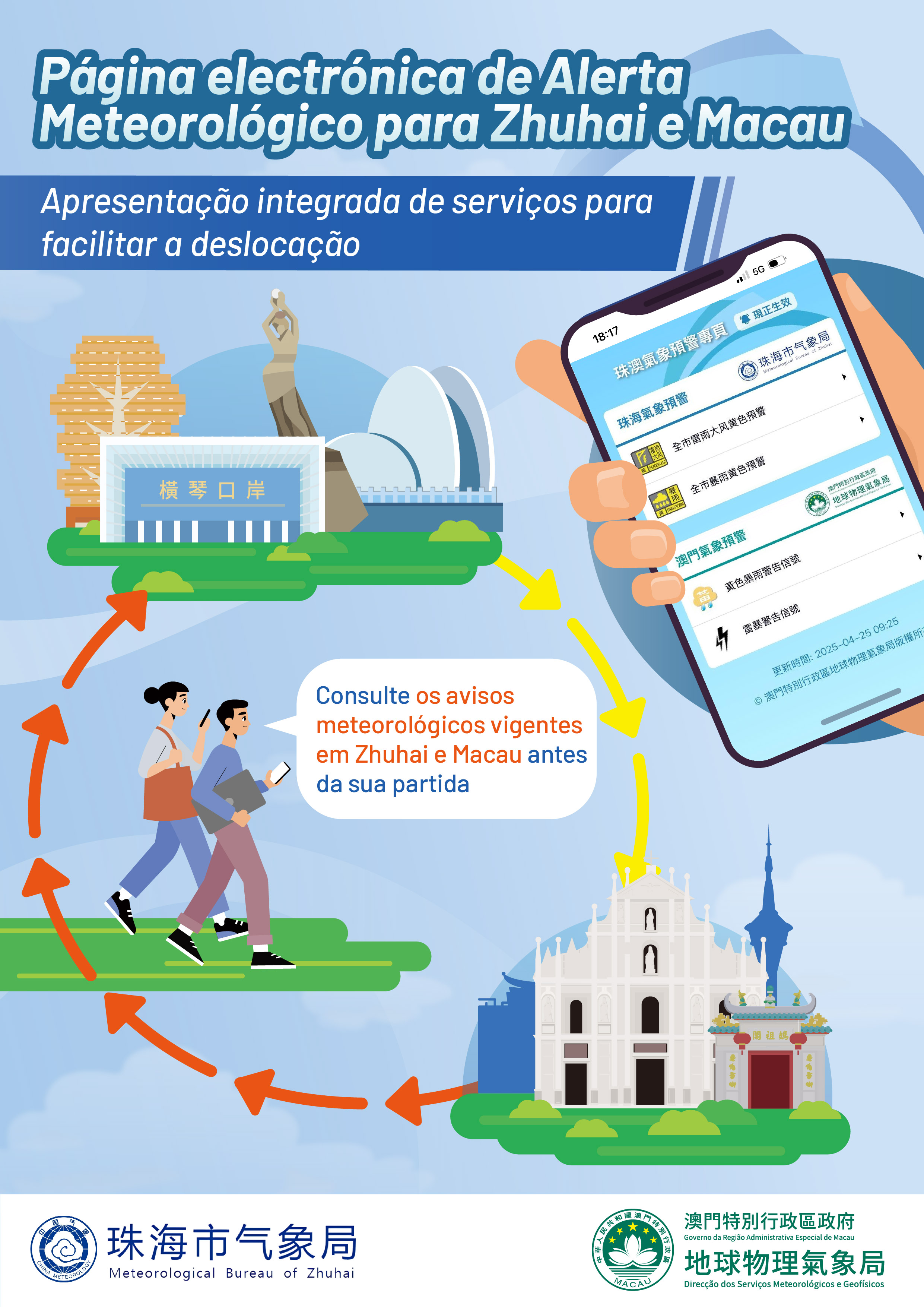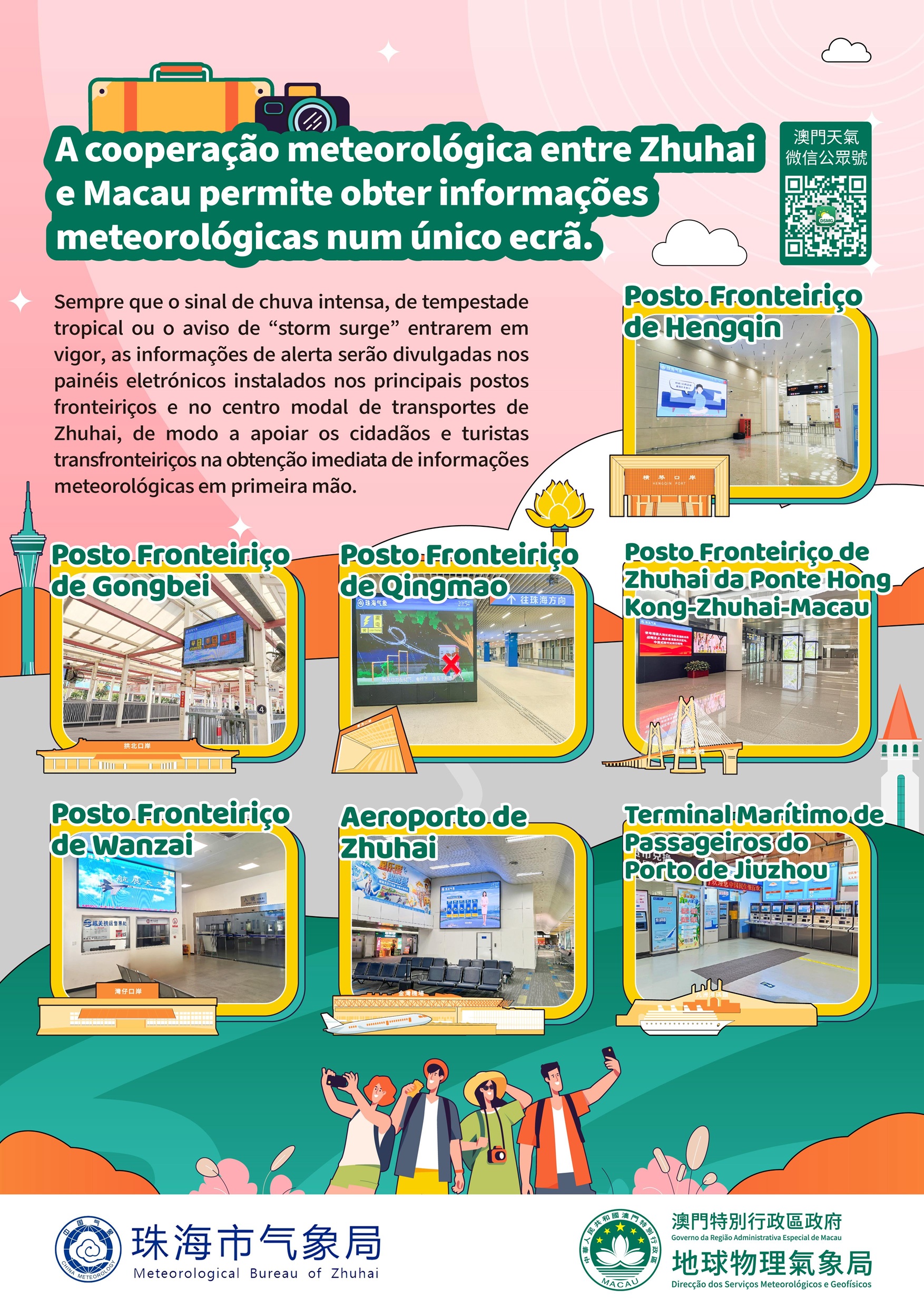 Com o objectivo de promover os serviços meteorológicos da Zona de Cooperação Aprofundada entre Guangdong e Macau, em Hengqin (daqui em diante designada como Zona de Cooperação), a Direcção dos Serviços Meteorológicos e Geofísicos de Macau e Zhuhai Meteorological Bureau lançaram em conjunto a página temática “Alerta Meteorológico Zhuhai-Macau”. Ao mesmo tempo, sempre que o sinal de chuva intensa, de tempestade tropical ou o aviso de “storm surge” entrarem em vigor em Macau, os quinze ecrãs electrónicos instalados nos sete postos fronteiriços e centros modais de transportes da cidade de Zhuhai vão mostrar as mensagens de alerta de Macau para facilitar o conhecimento aos cidadãos, utentes transfronteiriços e turistas das informações de alerta meteorológico de Zhuhai e Macau, de modo a que possam planear melhor a viagem e tomar medidas de resposta.