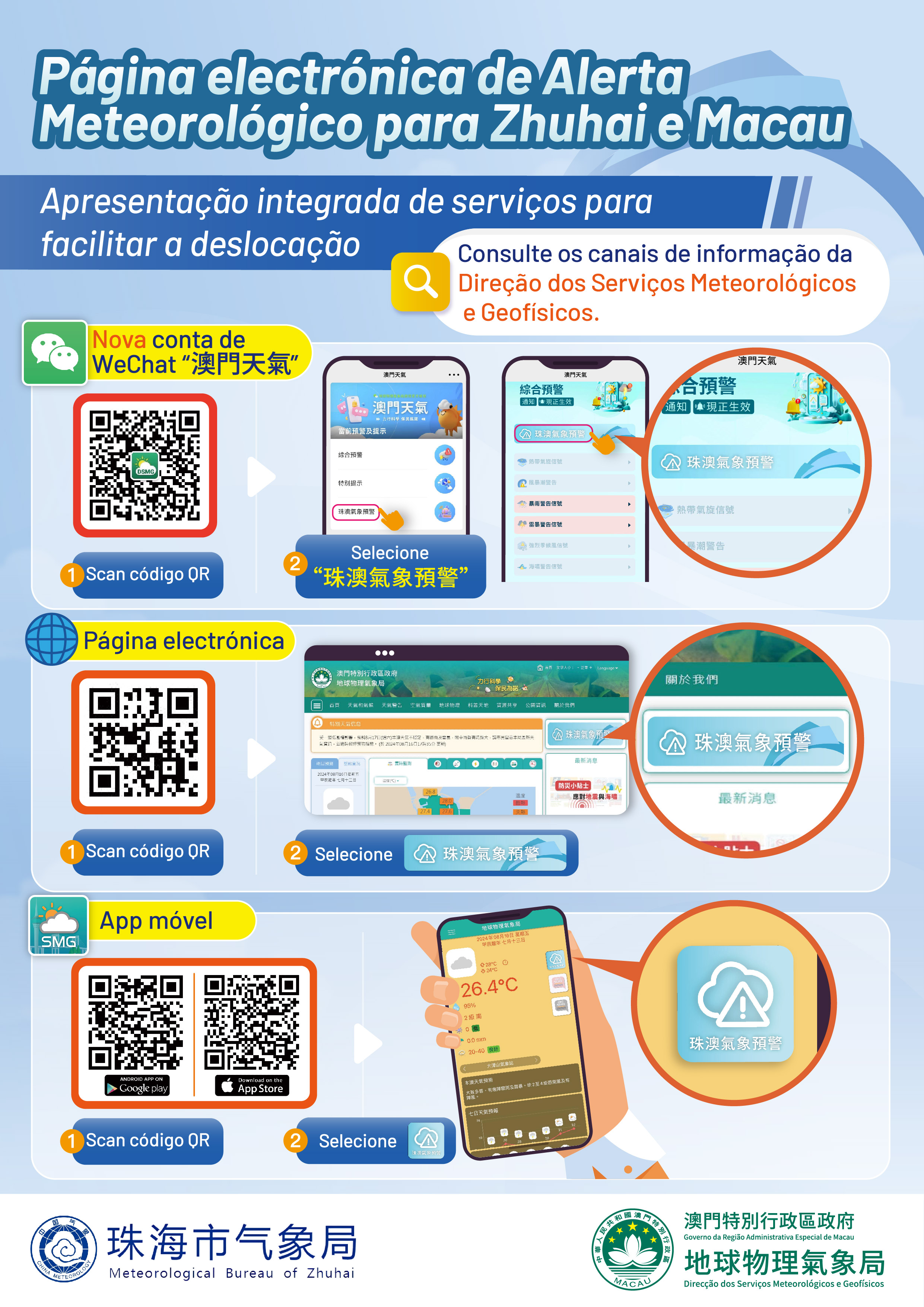 A página electrónica temática “Alerta Meteorológico Zhuhai-Macau” permite a partilha em tempo real de informações meteorológicas entre Zhuhai e Macau, cobrindo plenamente as informações de aviso de mau tempo, tais como chuvas intensas, tempestades tropicais, etc., para facilitar aos cidadãos e turistas a obtenção de informações meteorológicas em primeira mão. A partir de hoje (19 de Maio), a população pode aceder à página temática “Alerta Meteorológico para Zhuhai e Macau”, através da página electrónica da DSMG (www.smg.gov.mo), da aplicação para telemóvel e da nova conta oficial de Wechat “澳門天氣” para obter as informações correspondentes.