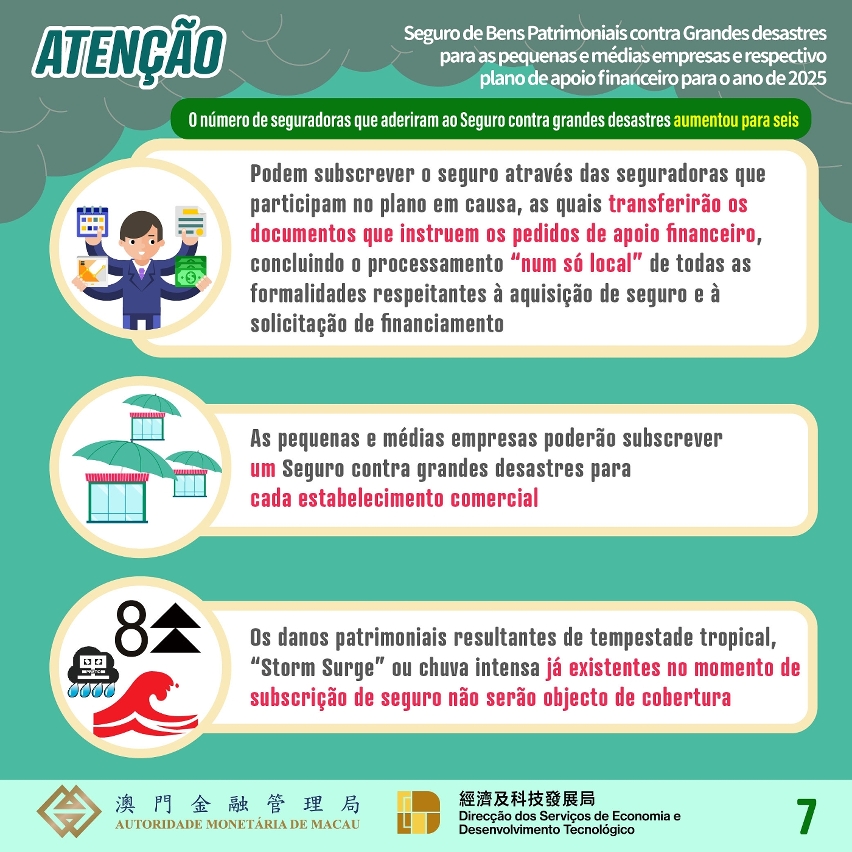 Com vista a facilitar a subscrição de seguros por parte dos comerciantes, o número de seguradoras locais que aderiram ao Seguro contra grandes desastres aumentou este ano para seis. As pequenas e médias empresas (PMEs) podem subscrever um “Seguro contra grandes desastres” para cada estabelecimento comercial. No âmbito deste programa, existem montantes seguros à escolha dos comerciantes, nomeadamente de MOP100.000, MOP200.000, MOP300.000 e MOP500.000.