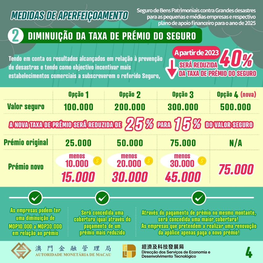 Entretanto, o Governo da RAEM continuará a conceder, através do Fundo de Desenvolvimento Industrial e de Comercialização, o apoio financeiro de prémio do seguro contra grandes desastres às PMEs qualificadas, sendo que o valor do apoio financeiro equivale a 50% ou a MOP30.000 do total anual do prémio padrão (consoante o valor mais baixo), com o intuito de reduzir os encargos financeiros das mesmas.