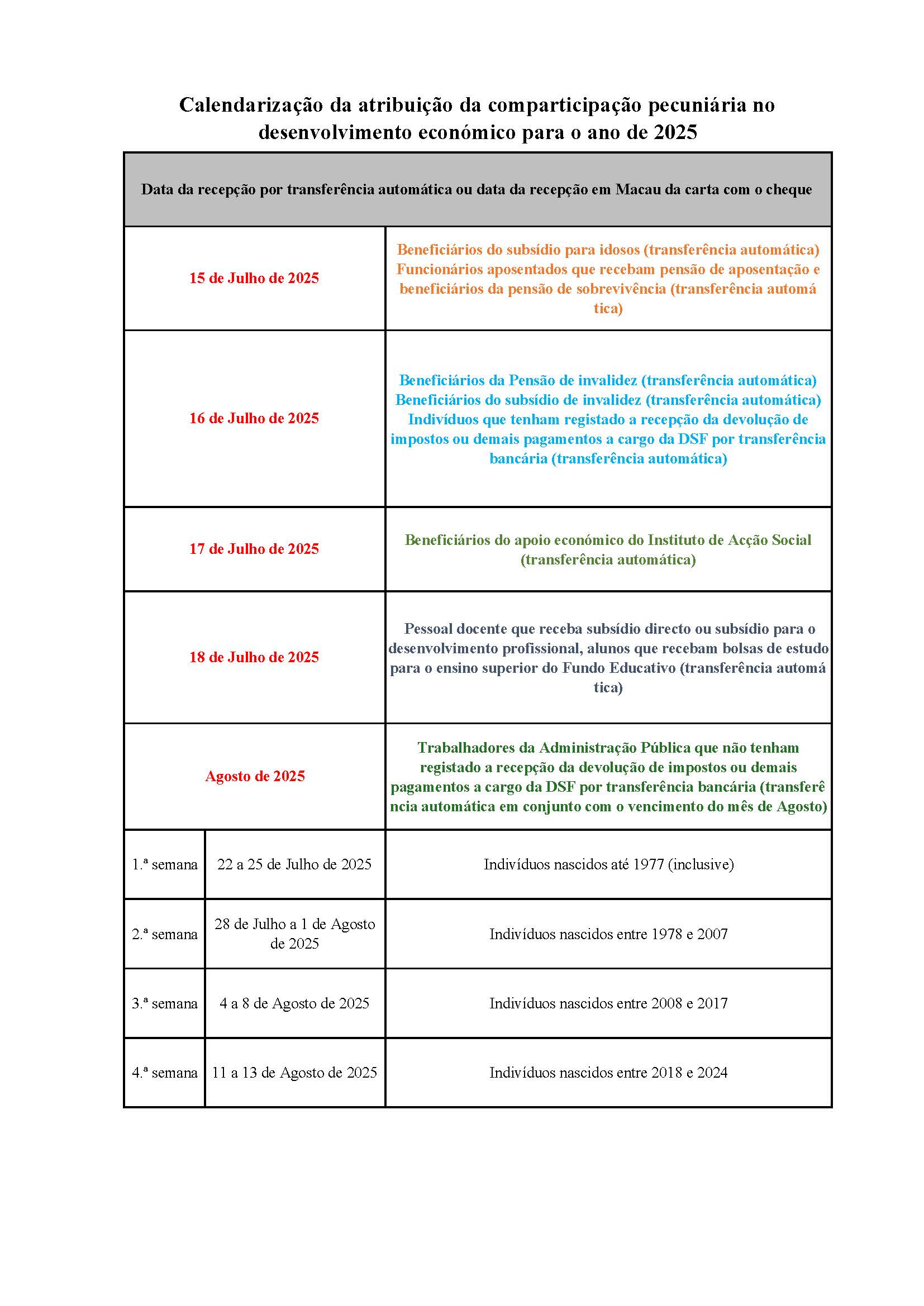 Ouvidas as opiniões da sociedade, e tendo como referência as disposições sobre a repartição extraordinária de saldos orçamentais constantes da Lei n.º 7/2017 (Regime de previdência central não obrigatório), o Governo da RAEM elaborou o regulamento administrativo relativo ao “Plano de comparticipação pecuniária no desenvolvimento económico para o ano de 2025”, que regula os requisitos de atribuição e as formalidades de requerimento da comparticipação pecuniária para o ano de 2025.