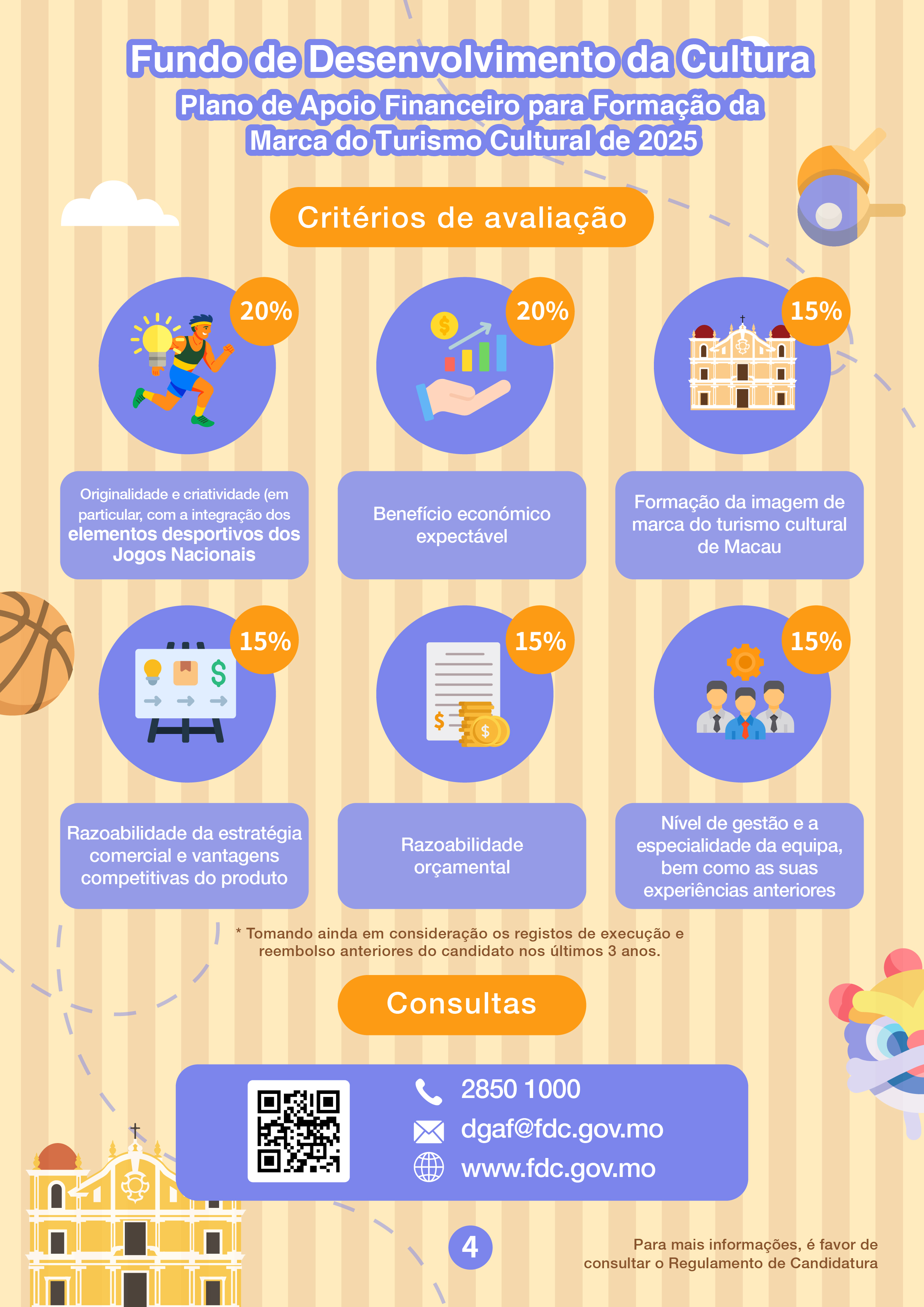 O FDC irá realizar duas sessões de esclarecimento, no dia 17 de Junho, no rés-do-chão do Edifício Público (endereço: Avenida da Amizade, n.º 1101A-1115, Edifício de Escritórios do Governo (ZAPE), rés-do-chão, Macau), das quais, a primeira sessão do “Plano de Subsídio à Divulgação e Distribuição de Obras Cinematográficas e Televisivas com Elementos de Macau de 2025” será realizada às 15h00 e a segunda sessão do “Plano de Apoio Financeiro para Formação da Marca do Turismo Cultural de 2025” será realizada às 16h30. Os interessados podem inscrever-se na página electrónica do FDC (www.fdc.gov.mo). Para quaisquer consultas, é favor de contactar-nos através do telefone, n.º 2850 1000 ou por email, dgaf@fdc.gov.mo.