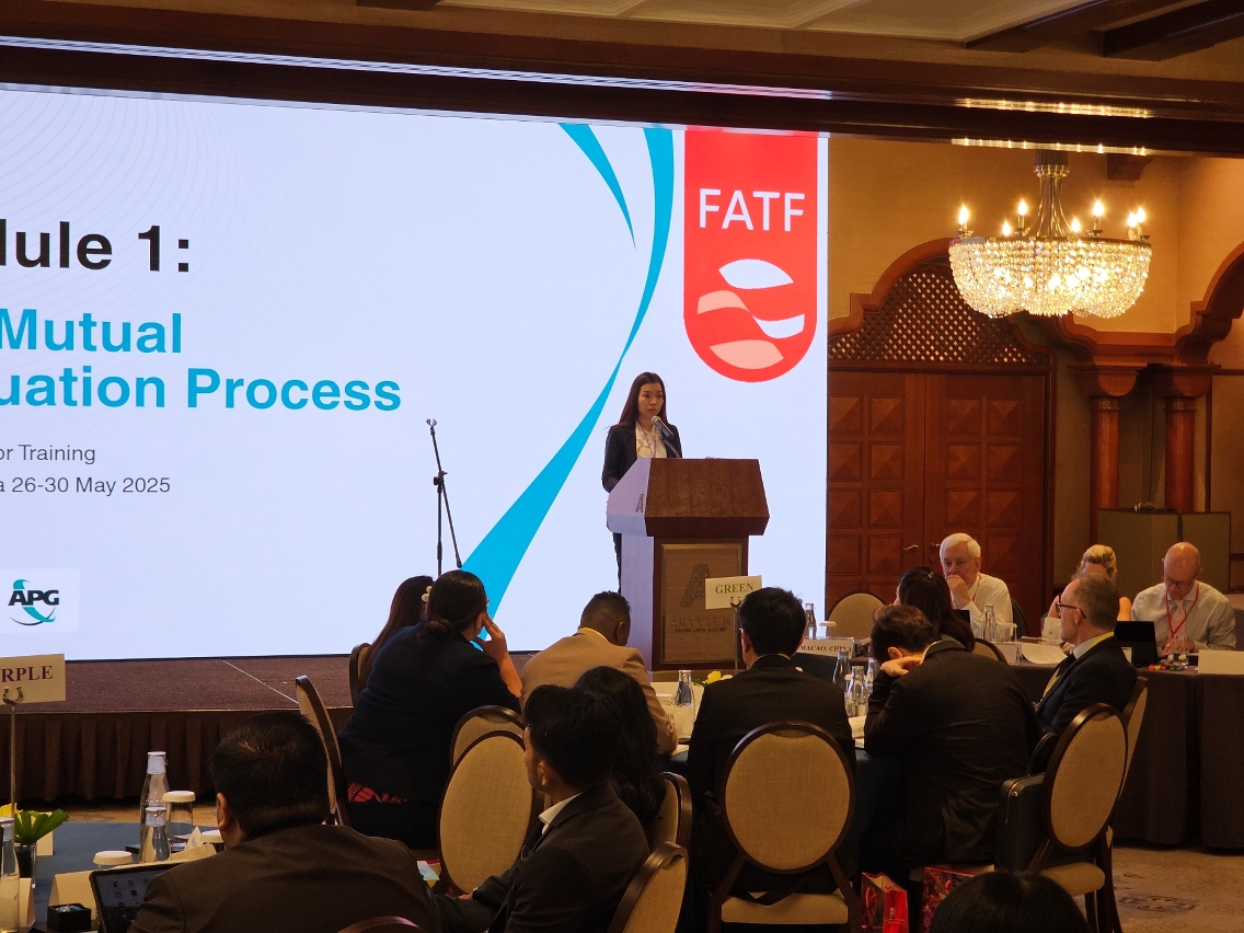 Para continuar a cumprir as obrigações da RAEM como membro do Grupo Ásia-Pacífico contra o Branqueamento de Capitais (APG) e formar profissionais locais nesta área, a RAEM, através da organização de conferências ou acções de formação de organizações internacionais, permite aprofundar a eficácia da cooperação com os intervenientes de outras jurisdições na prevenção e combate às actividades criminosas de branqueamento de capitais, financiamento ao terrorismo e financiamento à proliferação de armas de destruição maciça, o que demonstra o empenho da RAEM no cumprimento dos compromissos assumidos nas organizações internacionais. Neste âmbito, o Gabinete de Informação Financeira (GIF) dos Serviços de Polícia Unitários realizou, em conjunto com o APG, o Curso de Formação de Avaliadores do APG. O evento teve lugar em Macau, entre 26 e 30 de Maio de 2025, tendo contado com a participação de cerca de 40 representantes de diferentes jurisdições. O GIF coordenou ainda os serviços membros do Grupo de Trabalho Interdepartamental contra o Branqueamento de Capitais e Financiamento ao Terrorismo para participarem nesta acção de formação.