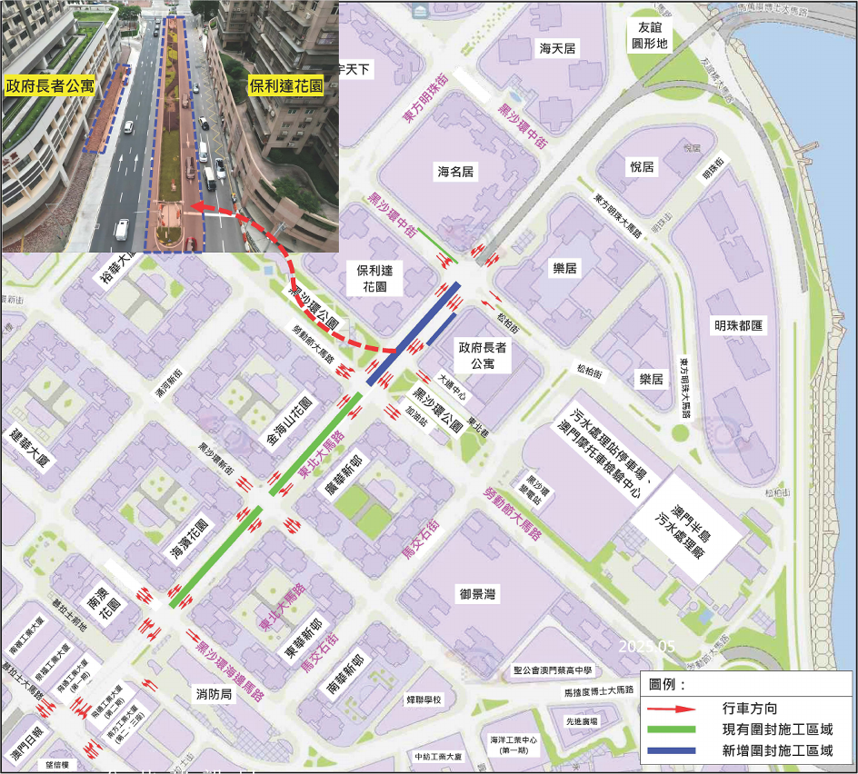 Para articular com a obra de construção da estrutura principal da travessia pedonal ao longo da Avenida do Nordeste, serão vedados adicionalmente, a partir do dia 1 de Julho, a faixa separadora central verde entre a Rua Central da Areia Preta e a Avenida 1º de Maio e uma parte do passeio no exterior da Residência para Idosos, bem como será implementado o condicionamento do trânsito (vide desenho) e, durante esse período, a Avenida do Nordeste irá manter a circulação de veículos em pelo menos duas faixas de rodagem, e não será afectado o funcionamento das actuais paragens de autocarros.
