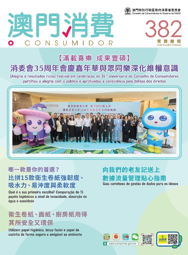 Sendo a qualidade um dos factores de ponderação para a escolha e compra, no sentido de proporcionar ao consumidor mais informações referenciais, o Conselho de Consumidores (CC) realizou um teste aos papéis higiénicos, cujos resultados revelaram que 4 das 15 amostras foram reprovadas em termos de desintegrabilidade, o que pode causar o entupimento da sanita. O relatório do teste encontra-se já publicado no recente boletim “O Consumidor” n.º 382. No intuito de ajudar os idosos a gerir melhor os dados do telemóvel e evitar um uso excessivo, o editorial do “O Consumidor” entrevistou um profissional para ensinar algumas técnicas simples de gestão de dados.