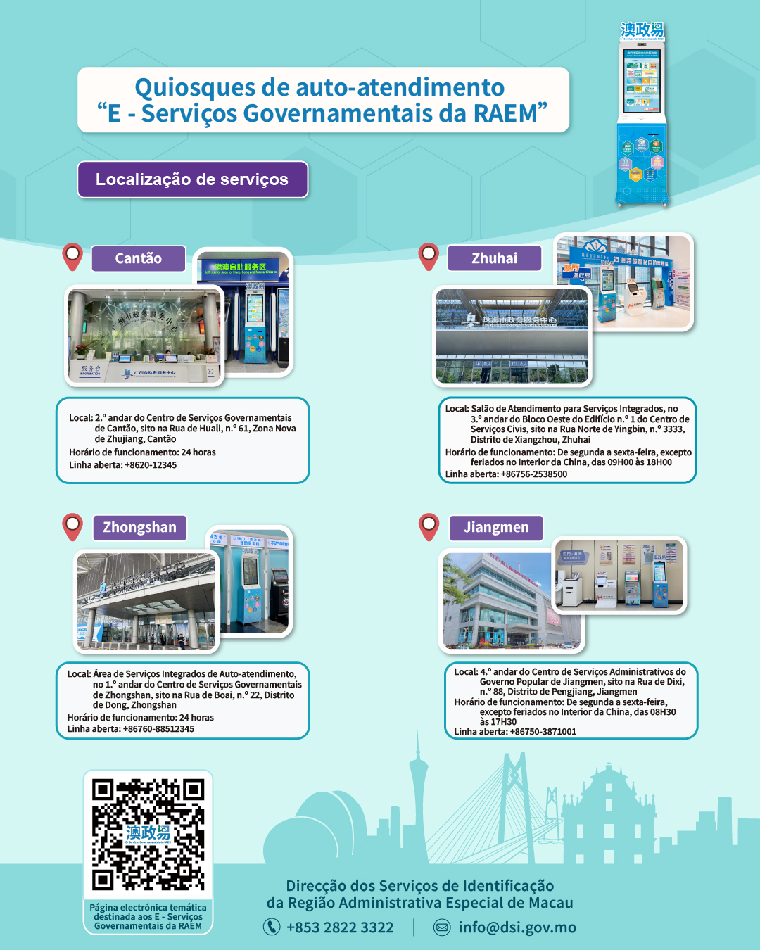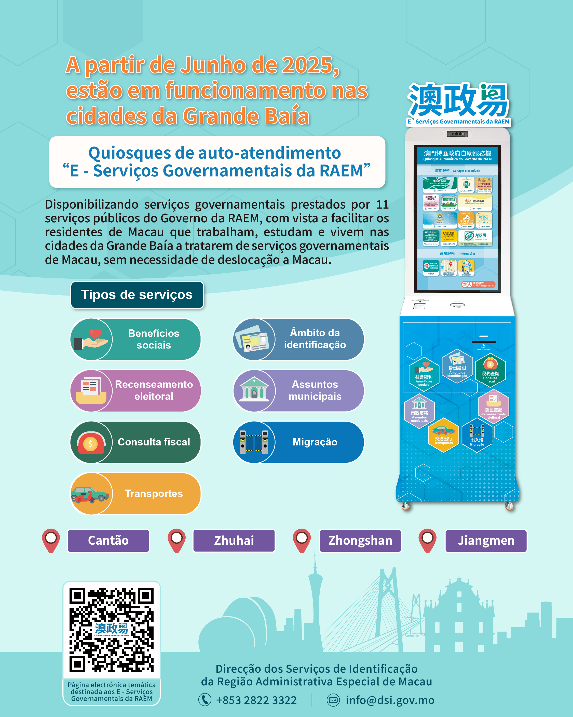 Para mais informações sobre os quiosques de auto-atendimento “E - Serviços Governamentais da RAEM”, consulte a página electrónica temática: https://www.dsi.gov.mo/mo-eservice/. Relativamente aos “Serviços públicos transfronteiriços”, queira consultar a página electrónica “Serviços públicos transfronteiriços” do website de Serviços Governamentais de Guangdong: https://apps.gdzwfw.gov.cn/kytb-hk/#/