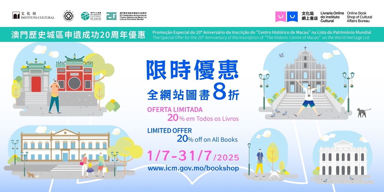 A fim de celebrar o 20.º Aniversário da Inscrição do Centro Histórico de Macau na Lista do Património Mundial, a Livraria Online do Instituto Cultural (IC) irá disponibilizar uma promoção especial entre 1 e 31 de Julho deste ano, podendo os leitores usufruir de um desconto de 20% em todos os livros disponíveis no website, bem como de descontos de 50% e 10% na aquisição das edições antigas e mais recentes da Revista de Cultura, respectivamente. Além disso, o cliente receberá, como oferta, uma colecção “Passeio pelos Sítios do Património Mundial - Colecção de Postais do Centro Histórico de Macau” em qualquer compra efectuada (ou seja, por cada transacção) na Livraria Online durante o período acima referido, estando a oferta sujeita à disponibilidade.