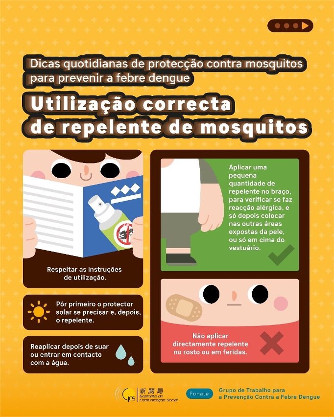Os Serviços de Saúde apelam aos residentes que devem tomar medidas preventivas de mosquitos, no sentido de reduzir o risco de infecção. Caso sejam infectados com diferentes tipos de vírus de febre de dengue, podem eventualmente causar casos graves de febre de dengue, pelo que é necessário reforçar a prevenção, recomendando-se a adopção das seguintes medidas: