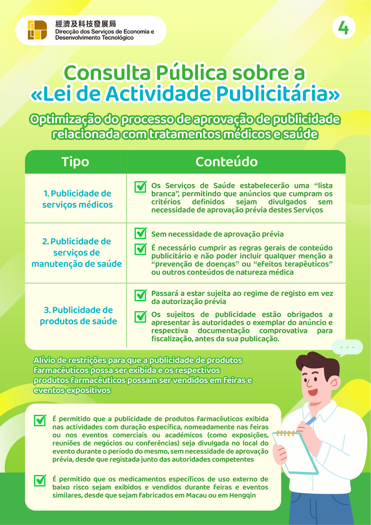 A Direção dos Serviços de Economia e Desenvolvimento Tecnológico (DSEDT) realizou hoje (dia 4) uma conferência de imprensa, presidida pelo seu director, Yau Yun Wah, para anunciar a abertura de uma consulta pública de 30 dias, de 4 de Julho a 2 de Agosto, sobre a revisão da “Lei de Actividade Publicitária”.