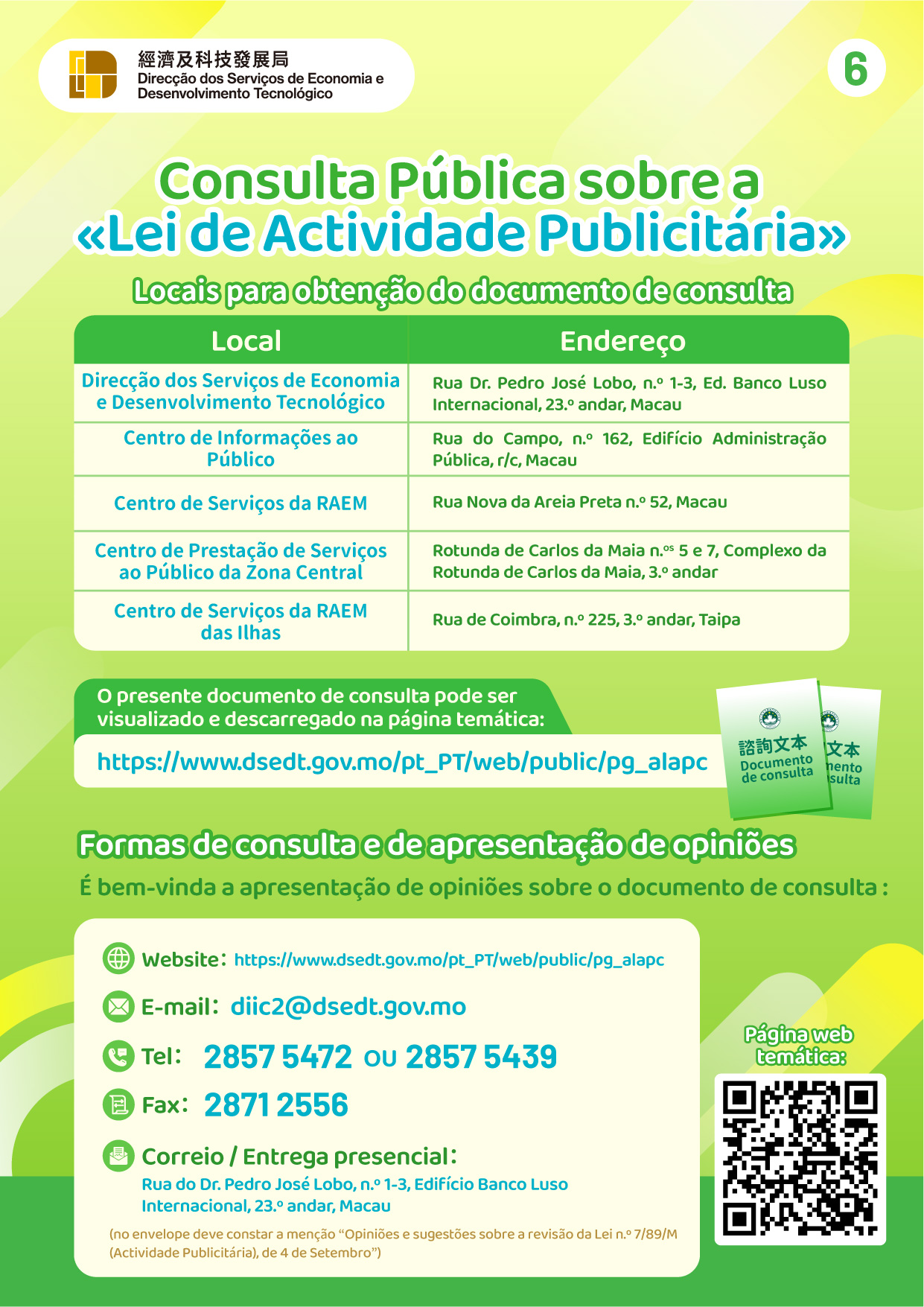 O documento de consulta sobre a revisão da “Lei de Atividade Publicitária” já está disponível para consulta e carregamento na página web temática: https://www.dsedt.gov.mo/pt_PT/web/public/pg_alapc. Os interessados também podem obter o documento de consulta nos seguintes locais: Direção dos Serviços de Economia e Desenvolvimento Tecnológico, Centro de Informação ao Público, Centro de Serviços da RAEM, Centro de Serviços da RAEM das Ilhas e Centro de Prestação de Serviços ao Público da Zona Central. Durante o período de consulta pública, todas as opiniões e sugestões sobre o conteúdo do documento de consulta são bem-vindas, as quais poderão ser apresentadas através da página web temática, por telefone, correio electrónico, fax, correio ou entrega presencial.