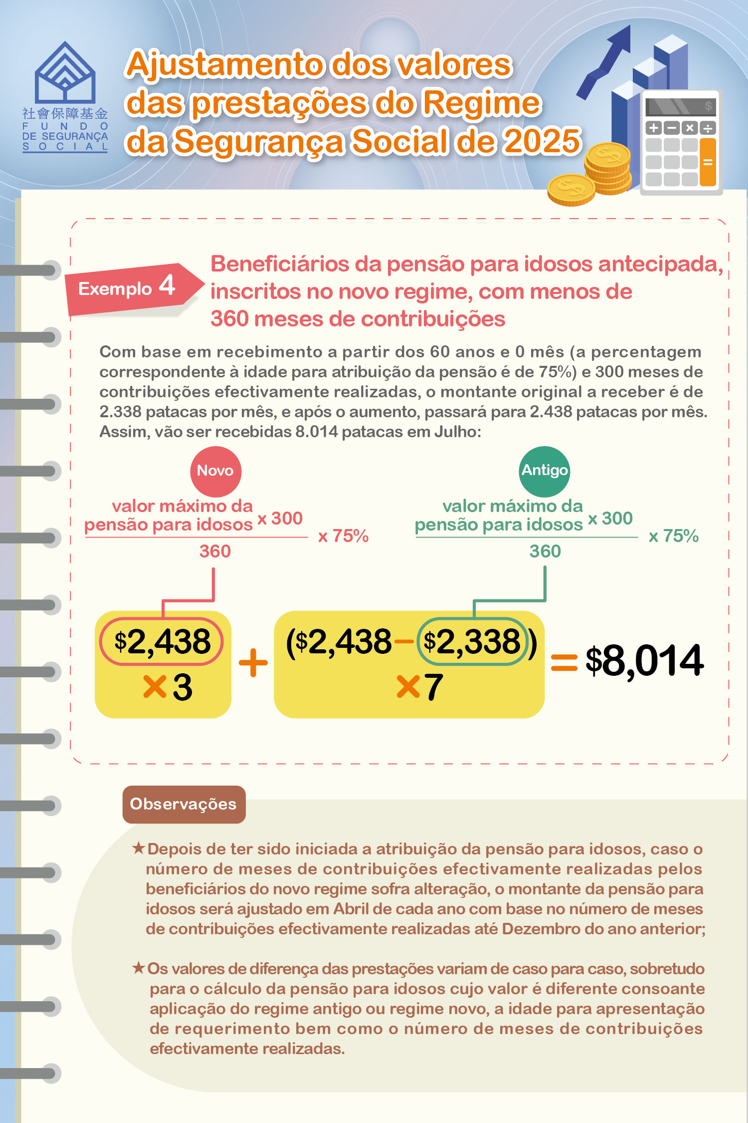Após o aumento, o valor máximo da pensão para idosos e a pensão de invalidez passam de 3.740 patacas para 3.900 patacas por mês, o subsídio de desemprego aumentado para 157 patacas por dia, o subsídio de doença com internamento hospitalar para 157 patacas por dia, o subsídio de doença sem internamento hospitalar aumenta para 119 patacas por dia, o subsídio de nascimento para 6.500 patacas, o subsídio de casamento para 2.220 patacas e o subsídio de funeral para 2.870 patacas, todos com efeitos retroactivos a 1 de Janeiro do corrente ano.