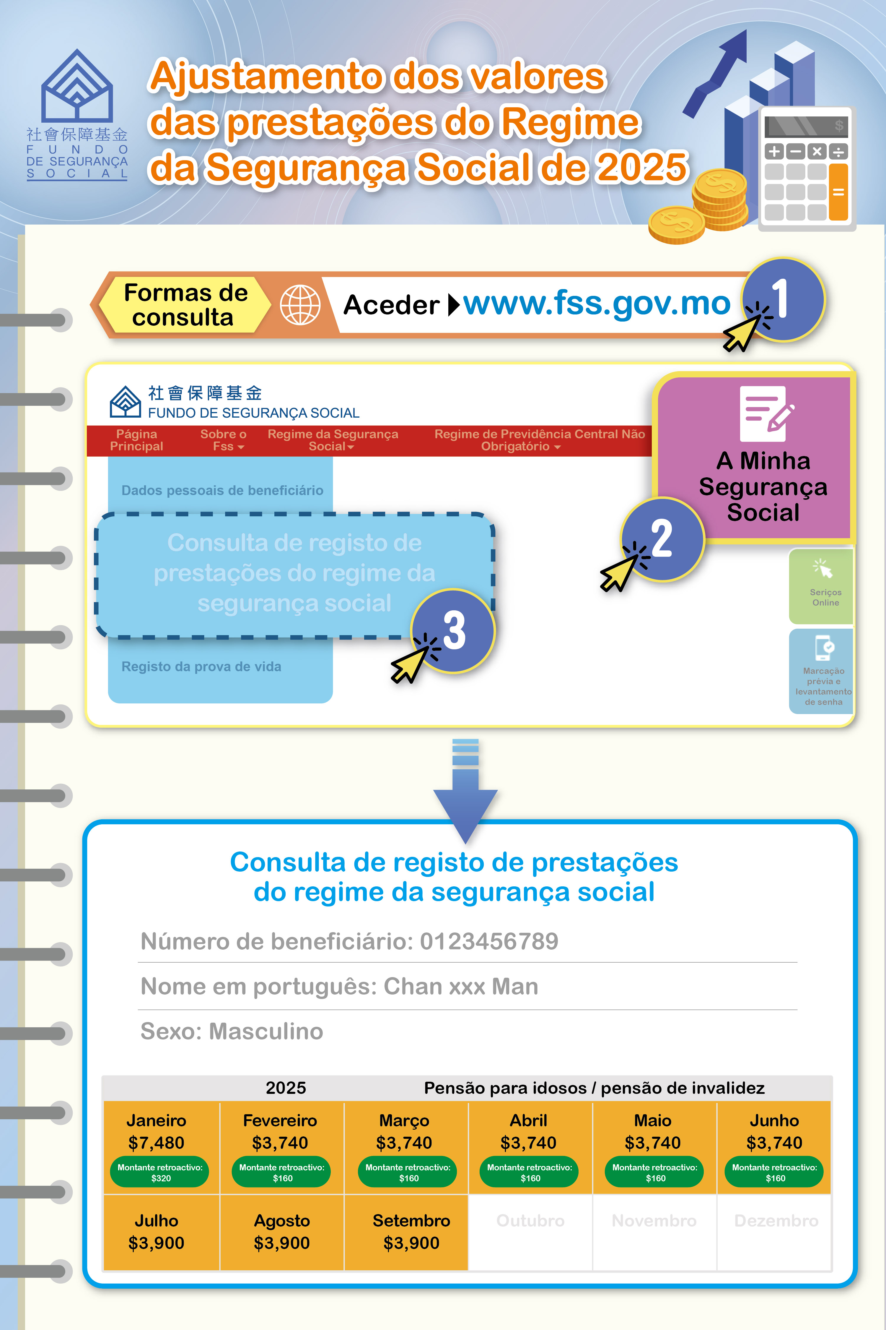 Os valores de diferença das prestações variam de caso para caso, sobretudo para o cálculo da pensão para idosos cujo valor é diferente consoante aplicação do regime antigo ou regime novo, a idade para apresentação de requerimento bem como o número de meses de contribuições efectivamente realizadas. Para o efeito, os beneficiários podem consultar os exemplos de cálculo nas infografias, ou clicar em “Consulta do registo de prestações do regime da segurança social” na página “A Minha Segurança Social” do sítio electrónico do FSS: www.fss.gov.mo para obter mais informações. Se tiver dúvidas, é favor contactar o FSS por via telefónica 28532850 durante o horário de expediente.
