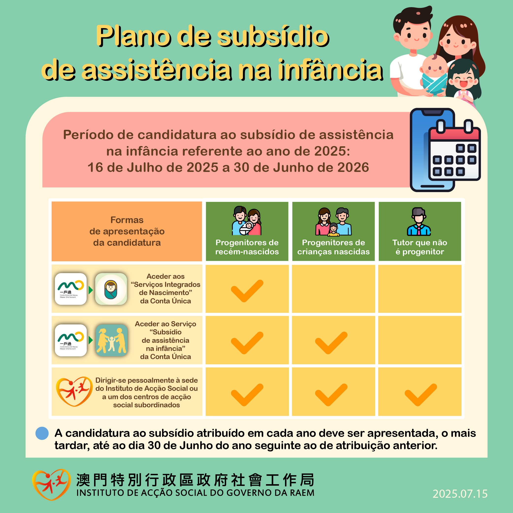 Para incentivar a natalidade e ajudar as famílias com bebés ou crianças a aliviar alguns dos seus encargos financeiros, o Governo da Região Administrativa Especial de Macau lançou o “Plano de subsídio de assistência na infância”, de natureza provisória, cuja recepção dos pedidos tem início no dia 16 de Julho de 2025, com o valor anual de 18.000 patacas. Os residentes da RAEM qualificados poderão apresentar o pedido através da aplicação para telemóvel da Conta Única de Macau ou dirigir-se pessoalmente ao Instituto de Acção Social (IAS), durante as horas de expediente.