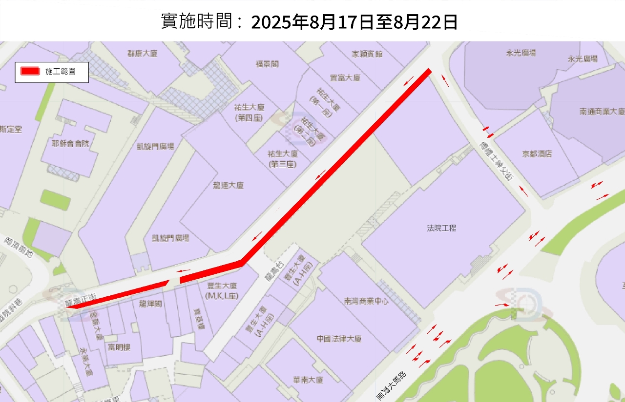 Os trabalhos de ligação de tubagens da empreitada de construção do edifício do tribunal na Avenida da Praia Grande estão a ser executados de forma ordenada, em três fases, desde o dia 16 de Junho do corrente ano, tendo a execução da primeira fase da obra sido concluída no dia 12 de Julho, dentro do prazo definido. Actualmente, encontra-se em curso a execução da segunda fase da obra, prevendo-se a sua conclusão no dia 10 de Agosto, conforme o prazo definido e, de seguida, no mesmo dia, terá início a execução da terceira fase da obra. Nessa altura, a circulação rodoviária na Avenida da Praia Grande será retomada à normalidade, mantendo-se o condicionamento de trânsito na Rua Central, e a proibição de estacionamento nos lugares com parquímetro para automóveis ligeiros e nos lugares para motociclos localizados na Rua Central junto da Plaza Victory.