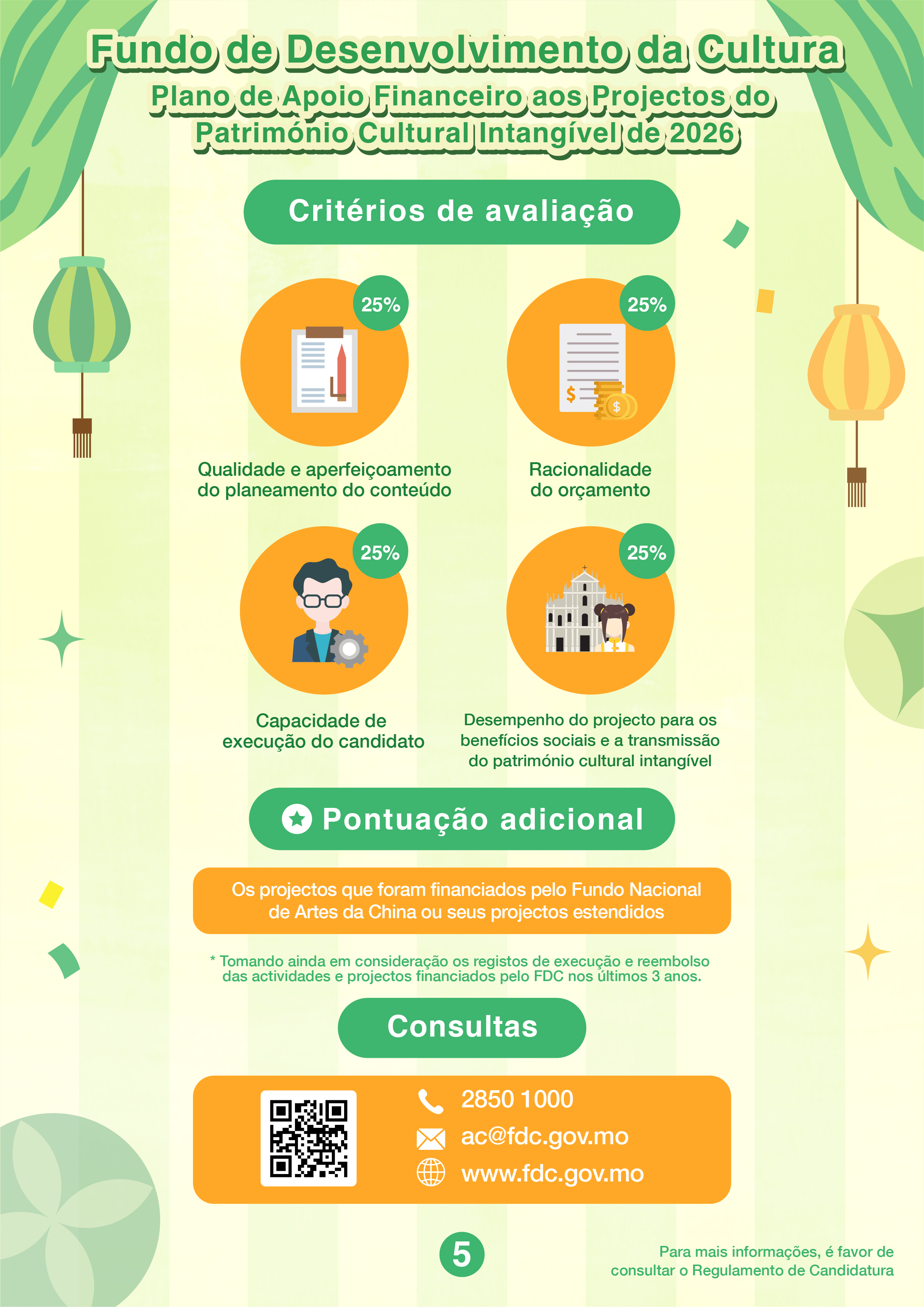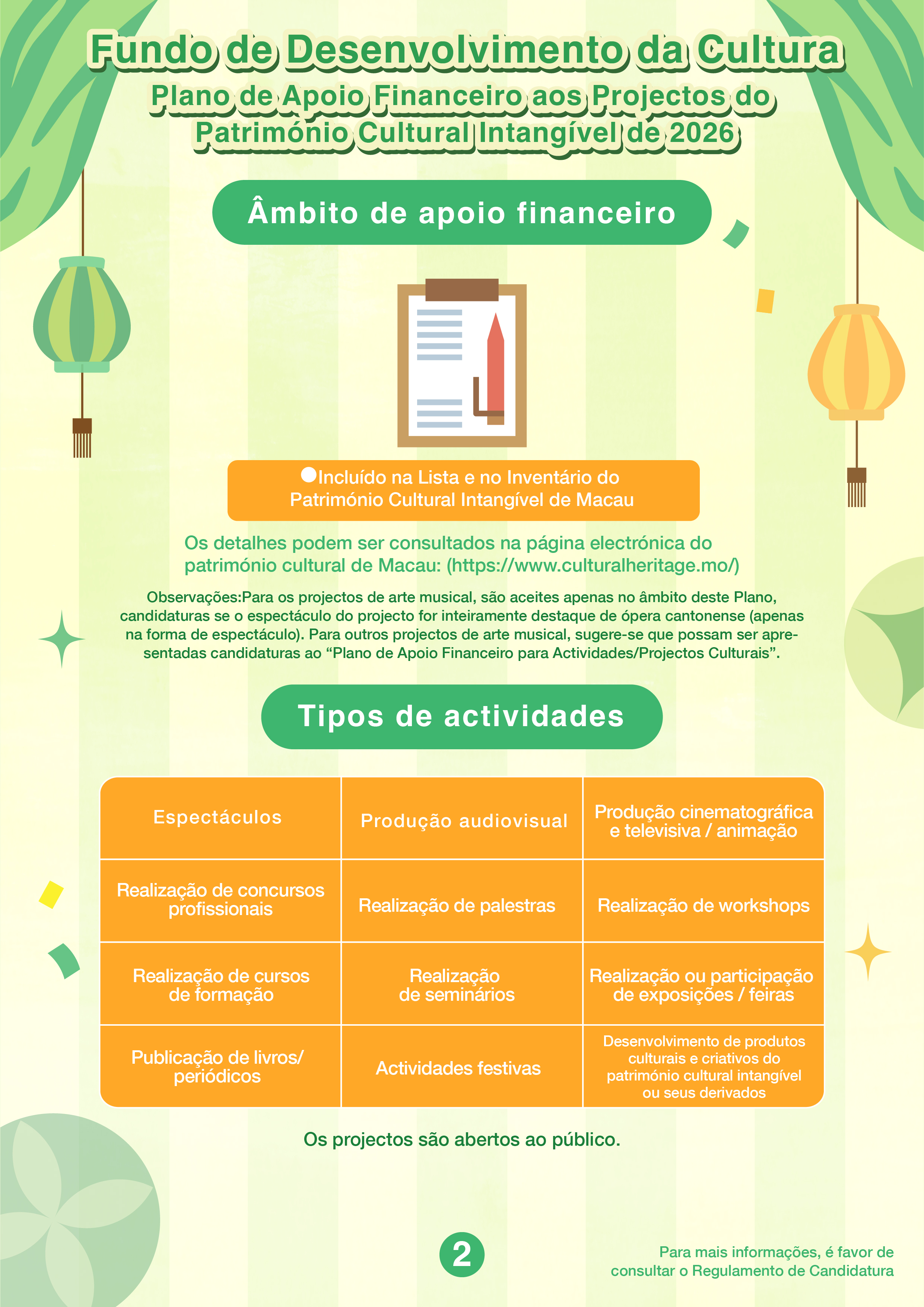 O “Plano de Apoio Financeiro aos Projectos do Património Cultural Intangível de 2026” visa incentivar as entidades que se dedicam à salvaguarda do património cultural intangível, associações ou fundações locais a apresentarem projectos candidatos, no intuito de promover a participação da comunidade na transmissão, sensibilização, estudo e divulgação do património cultural intangível. O âmbito de apoio financeiro é limitado aos projectos já incluídos na Lista e no Inventário do Património Cultural Intangível de Macau, incluindo candidaturas cujo conteúdo seja inteiramente constituído por destaque de ópera cantonense, podendo outros projectos relacionados de arte musical candidatar-se ao “Plano de Apoio Financeiro para Actividades/Projectos Culturais”. A modalidade do apoio financeiro deste Plano é por subsídios, com o período de apoio financeiro de um ano.