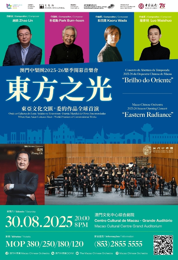 O concerto de abertura da Temporada 2025–26 da Orquestra Chinesa de Macau, intitulado “Brilho do Oriente”, terá lugar no dia 30 de Agosto (Sábado), às 20:00 horas, no Grande Auditório do Centro Cultural de Macau. Sob a batuta do Director Musical e Maestro Principal, Zhang Lie, o concerto contará com a estreia da Suíte Sinfónica de Música Tradicional Chinesa “Brilho do Oriente”, composta em conjunto por compositores da China, Japão e Coreia do Sul, numa criação que celebra a integração cultural e a sinergia artística dos três países no âmbito do programa da “Cidade de Cultura da Ásia Oriental”. O concerto incluirá ainda uma selecção de obras encomendadas e peças clássicas de inspiração regional. Os bilhetes já se encontram disponíveis através da Bilheteira Online de Macau.