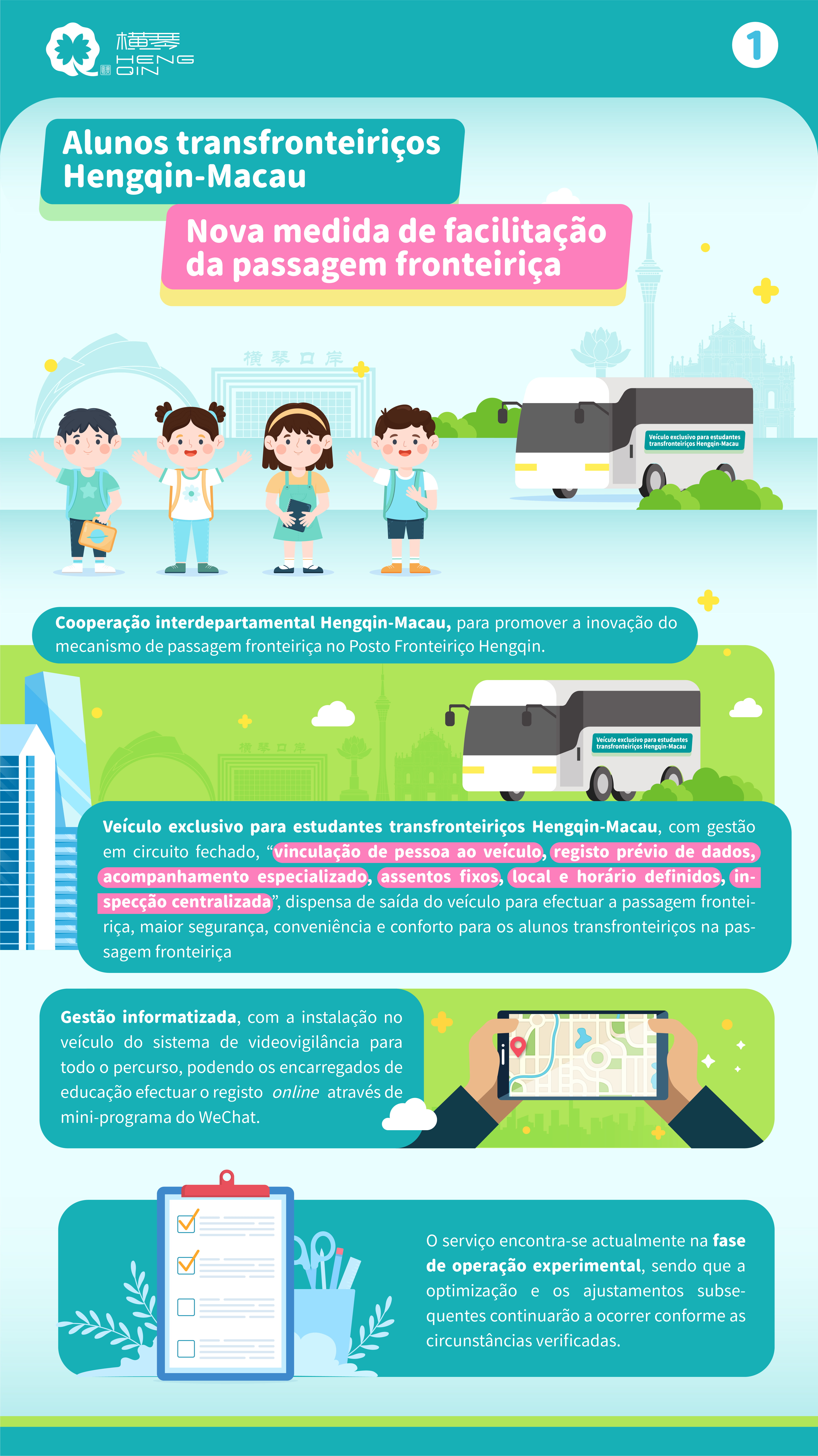 Na fase de operação experimental, o serviço de Veículo exclusivo para estudantes transfronteiriços Hengqin-Macau destina-se aos alunos transfronteiriços Hengqin-Macau que frequentam do 4.º ano do ensino primário ao 3.º ano do ensino secundário complementar, sejam residentes permanentes de Macau, de nacionalidade chinesa e titulares do Salvo-Conduto para Deslocação ao Interior da China dos Residentes de Hong Kong e Macau. O serviço funciona, a título experimental, durante o semestre de Outono do ano lectivo 2025/2026, com a disponibilização de 6 carreiras de frequência escolar no período da manhã e 2 carreiras de regresso a casa no período da tarde. Foram criadas para o efeito 17 paragens na Península de Macau, Taipa e Coloane, e 6 paragens na Zona de Cooperação, abrangendo 27 escolas de Macau. A inscrição pode ser efectuada no mini-programa do WeChat “Posto Fronteiriço Hengqin-Macau”, estando, entretando, já inscritos, na primeira ronda, 65 alunos. Em meados de Outubro disponibilizam-se as vagas remanescentes para as inscrições dos alunos interessados e pretende-se receber as inscrições antes do início de cada semestre.