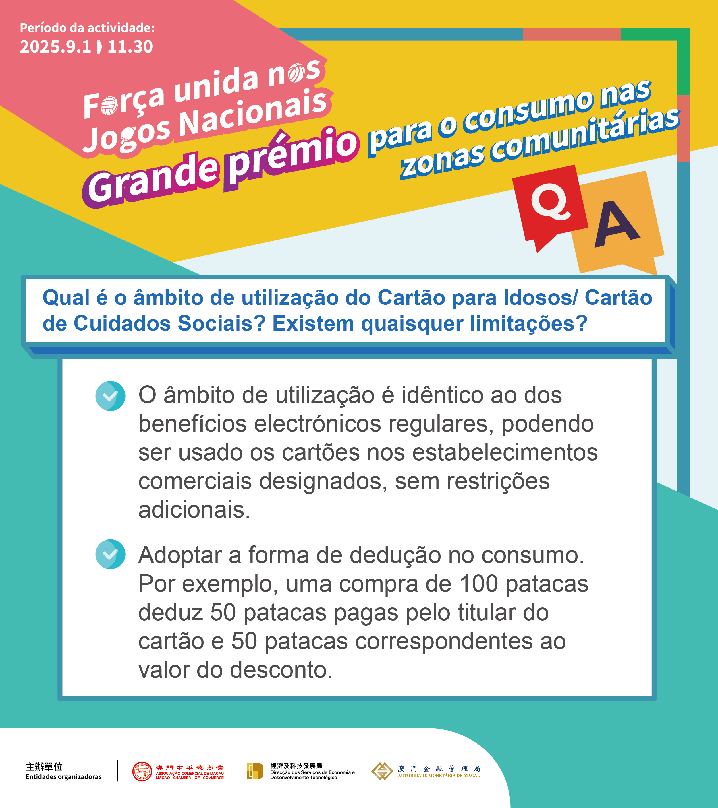 Para estimular a confiança no mercado de consumo, o Governo da RAEM e a Associação Comercial de Macau, aproveitando os efeitos dos grandes eventos - 15.ª edição dos Jogos Nacionais, Jogos Nacionais para Pessoas Portadoras de Deficiência e Jogos Olímpicos Especiais Nacionais, coorganizam uma actividade promocional de consumo intitulada “Força unida nos Jogos Nacionais – Grande prémio para o consumo nas zonas comunitárias”, que decorre entre 1 de Setembro e 30 de Novembro, com uma duração de 13 semanas. Durante o período da actividade, de segunda a sexta-feira de cada semana, quando efectuar o primeiro pagamento nas lojas elegíveis de Macau com a carteira electrónica autenticada de nome real, no valor não inferior a 50 patacas por transacção, pode obter 3 oportunidades de ganhar cupões de benefícios electrónicos.