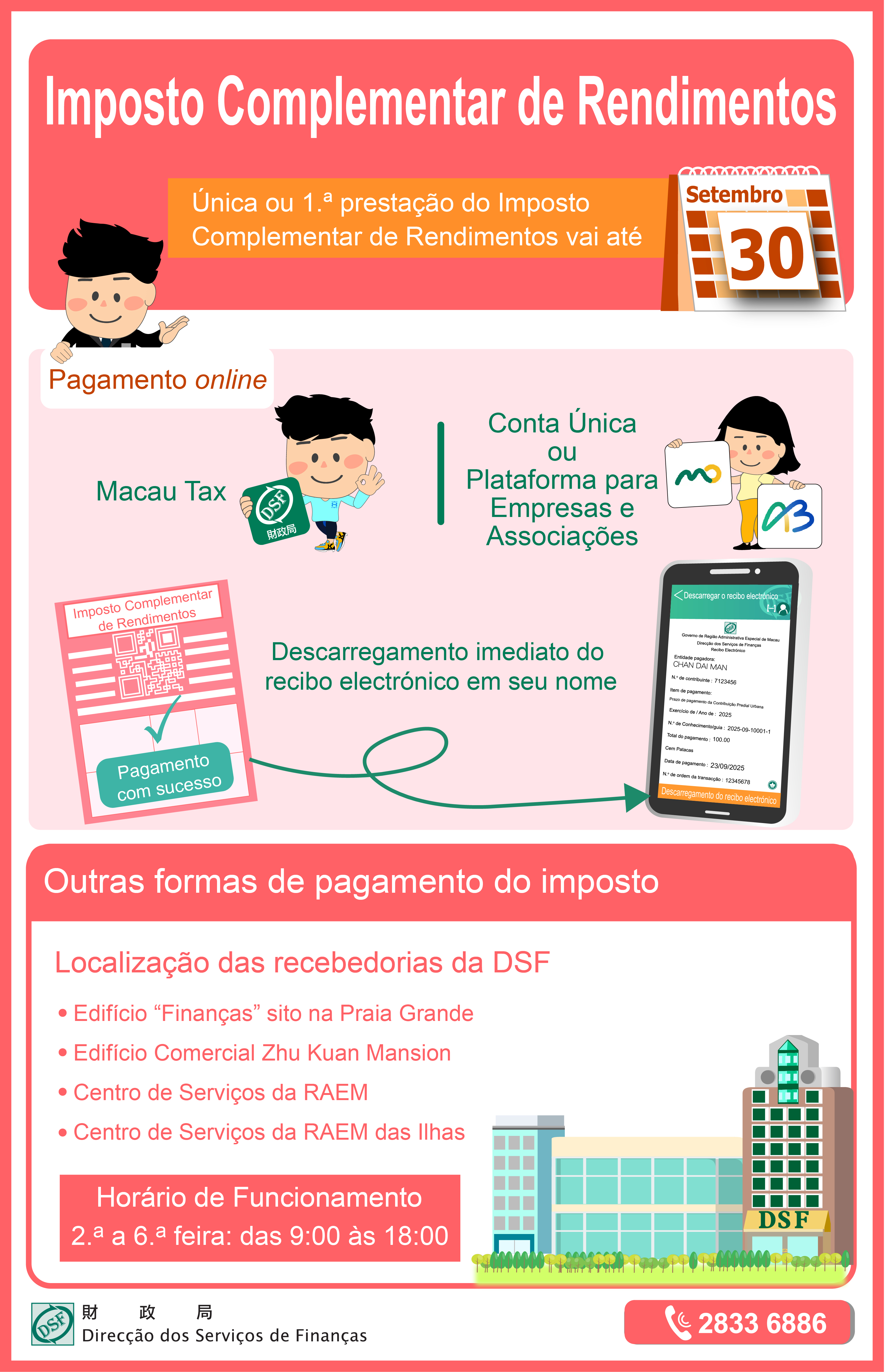 A Direcção dos Serviços de Finanças vem lembrar os contribuintes que o prazo de pagamento da única ou 1.ª prestação do Imposto Complementar de Rendimentos referente ao mês de Setembro, termina no dia de 30 de Setembro. Nos casos em que a 1.ª prestação não seja paga dentro do prazo legal, para além da cobrança de juros de mora e 3% de dívidas, sucede também o vencimento imediato da prestação vincenda.