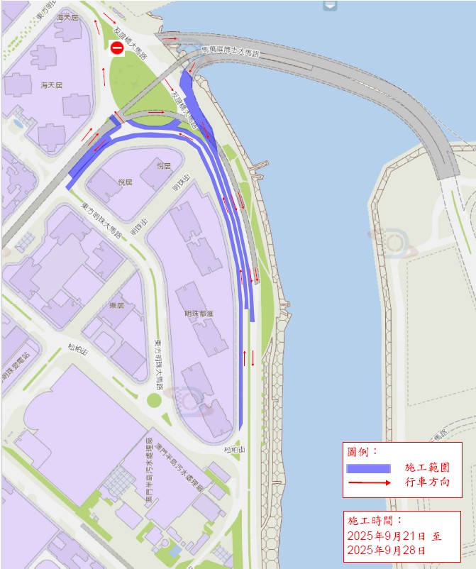 A fim de haver articulação com a «Empreitada de Construção de Viaduto na Rotunda da Amizade - 2.a Fase», serão efectuados trabalhos de repavimentação, com asfalto, na Avenida da Ponte da Amizade, na Avenida do Nordeste e nas vias circundantes da Rotunda da Amizade, de 21 de Setembro a 30 de Setembro de 2025, e durante esse período serão implementadas as seguintes medidas provisórias de desvio de trânsito (os detalhes encontram-se na listagem e na figura em anexo), pelo que se solicita aos condutores para que prestem atenção à sinalização de trânsito in loco, bem como que cumpram as instruções e disposições dos agentes de trânsito no local.