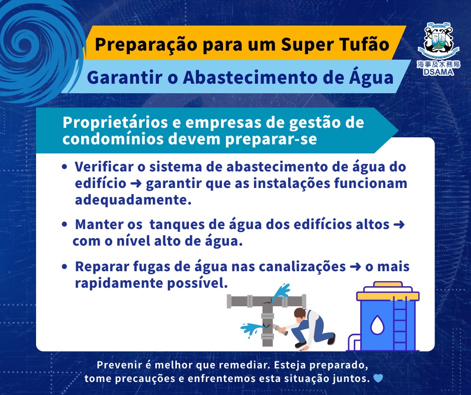 Devido à aproximação do super tufão, prevê-se um aumento na procura de água antes e depois da passagem do tufão em comparação com os dias normais, a Direcção dos Serviços de Assuntos Marítimos e de Água (DSAMA) coordenou com a Sociedade de Abastecimento de Águas de Macau (SAAM) na implementação prévia das medidas de protecção contra tufão e inundações, de modo a garantir a segurança e a estabilidade do abastecimento de água durante a passagem do tufão.