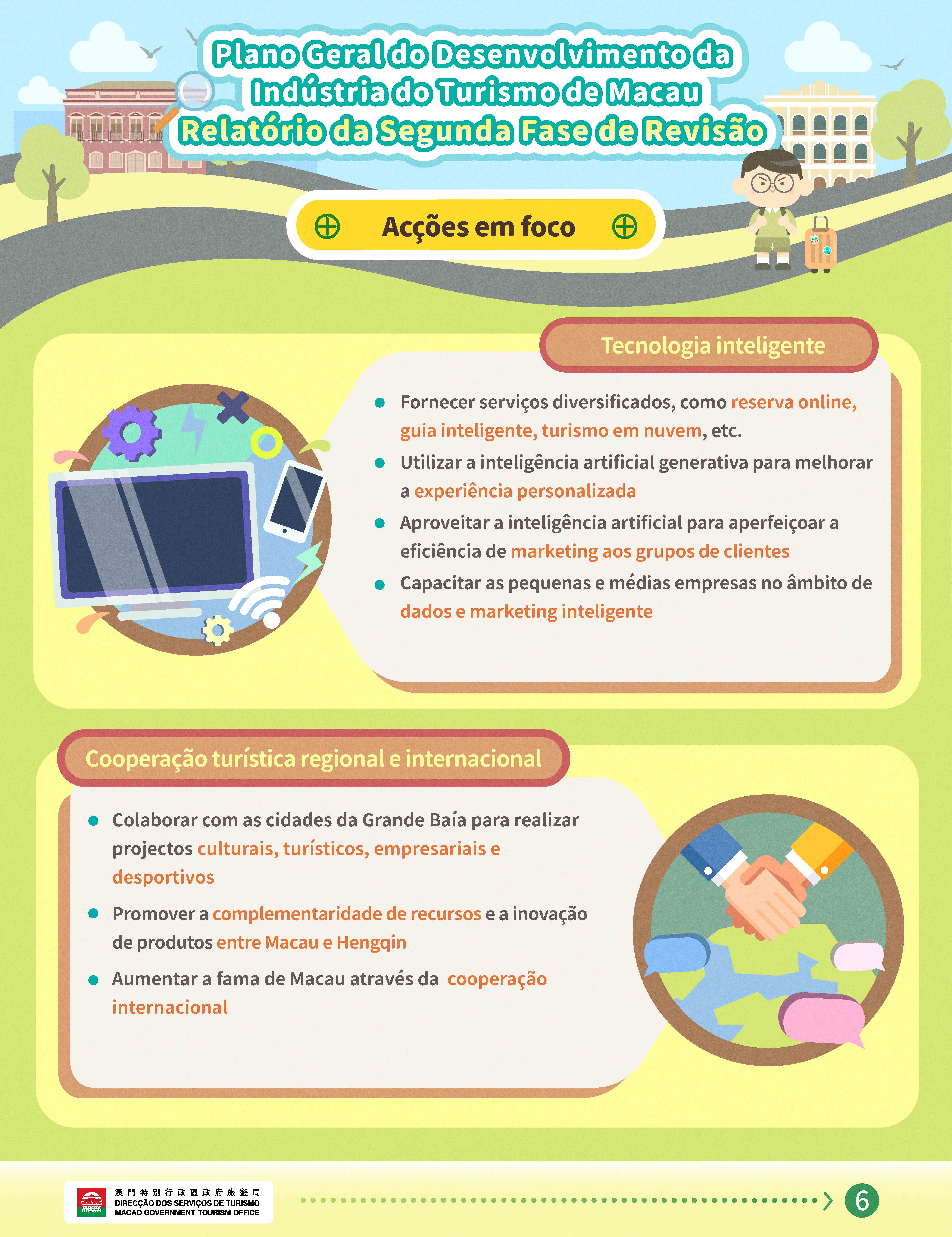 Entre as acções em foco inclui-se produtos turísticos agrupando diferentes elementos, atrair projectos conhecidos mundialmente, elevar o valor das marcas locais; fornecer cursos de formação atendendo a mercados de clientes específicos, formar quadros qualificados inovadores na era da inteligência artificial; realizar campanhas de marketing online e presenciais direccionadas, desenvolver produtos turísticos multi-destinos; expandir grupos potenciais de visitantes, ampliar capacidade do aeroporto e dos postos fronteiriços; aproveitar inteligência artificial para elevar experiência dos visitantes, capacitar serviços das pequenas e médias empresas; reforçar o aprofundamento da cooperação turística com Hengqin e com cidades da Grande Baía Guangdong-Hong Kong-Macau, promover a cooperação internacional, entre outros.