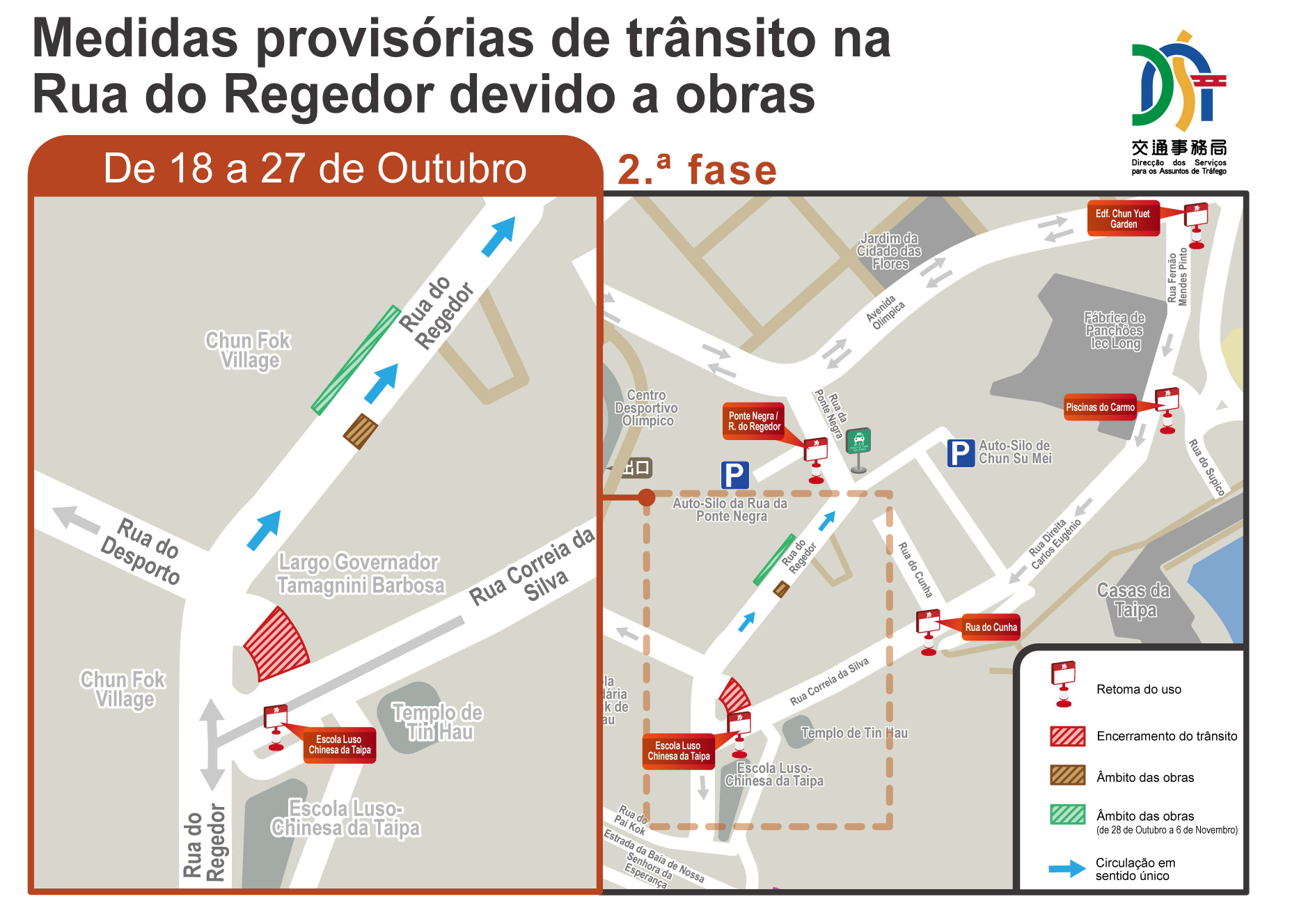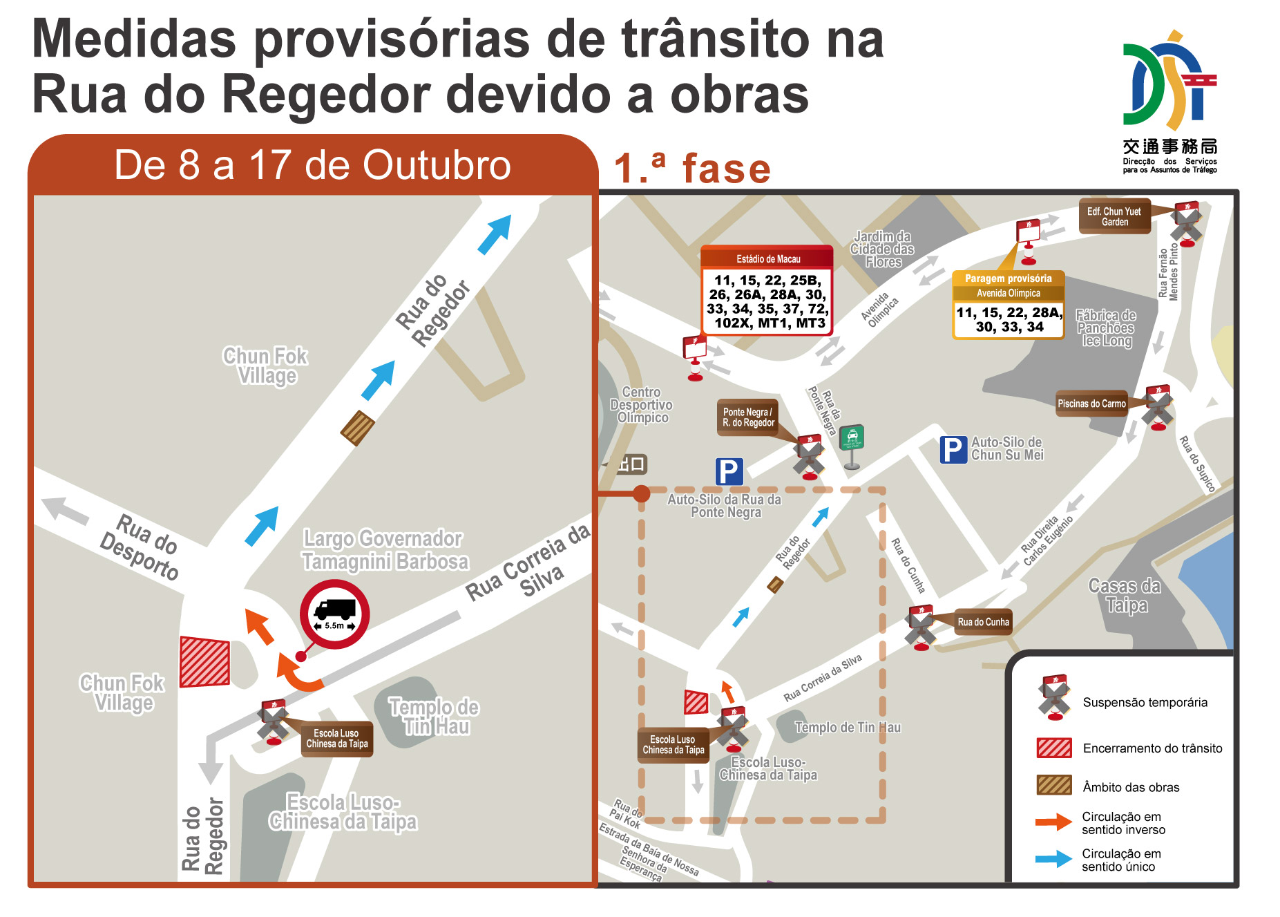 Para efectuar a ligação de colectores de um novo edifício, bem como proceder à instalação conjunta de cabos eléctricos, condutas de água e outras tubagens, assim como realizar trabalhos de repavimentação viária a cargo do Instituto para os Assuntos Municipais (IAM) e das entidades de interesse público, a partir de 8 de Outubro, nas imediações da Rua do Regedor, do Largo Governador Tamagnini Barbosa e da Rua Direita Carlos Eugénio, na Taipa, serão implementadas, por fases, diversas medidas temporárias de trânsito, incluindo encerramento de circulação e adopção de sentido único, conforme detalhado na Tabela 1. Na primeira fase, entre 8 e 17 de Outubro, estará limitado o comprimento dos veículos autorizados a circular na Rua do Regedor, o que obrigará ao desvio de várias carreiras de autocarros públicos que atravessam o bairro antigo da Taipa. Durante este período, alguns pontos de paragem situados no bairro deixarão temporariamente de ser usados. Os utentes poderão utilizar a paragem provisória na Avenida Olímpica, junto à Fábrica Va Nam, ou a paragem “Estádio de Macau”. Informações mais detalhadas encontram‑se na Tabela 2 ou nos sítios electrónicos das duas operadoras de autocarros (TCM: http://www.tcm.com.mo; Transmac: http://www.transmac.com.mo). Nas fases subsequentes das obras, a partir de 18 de Outubro, serão restabelecidas as rotas das carreiras públicas e as respectivas paragens.